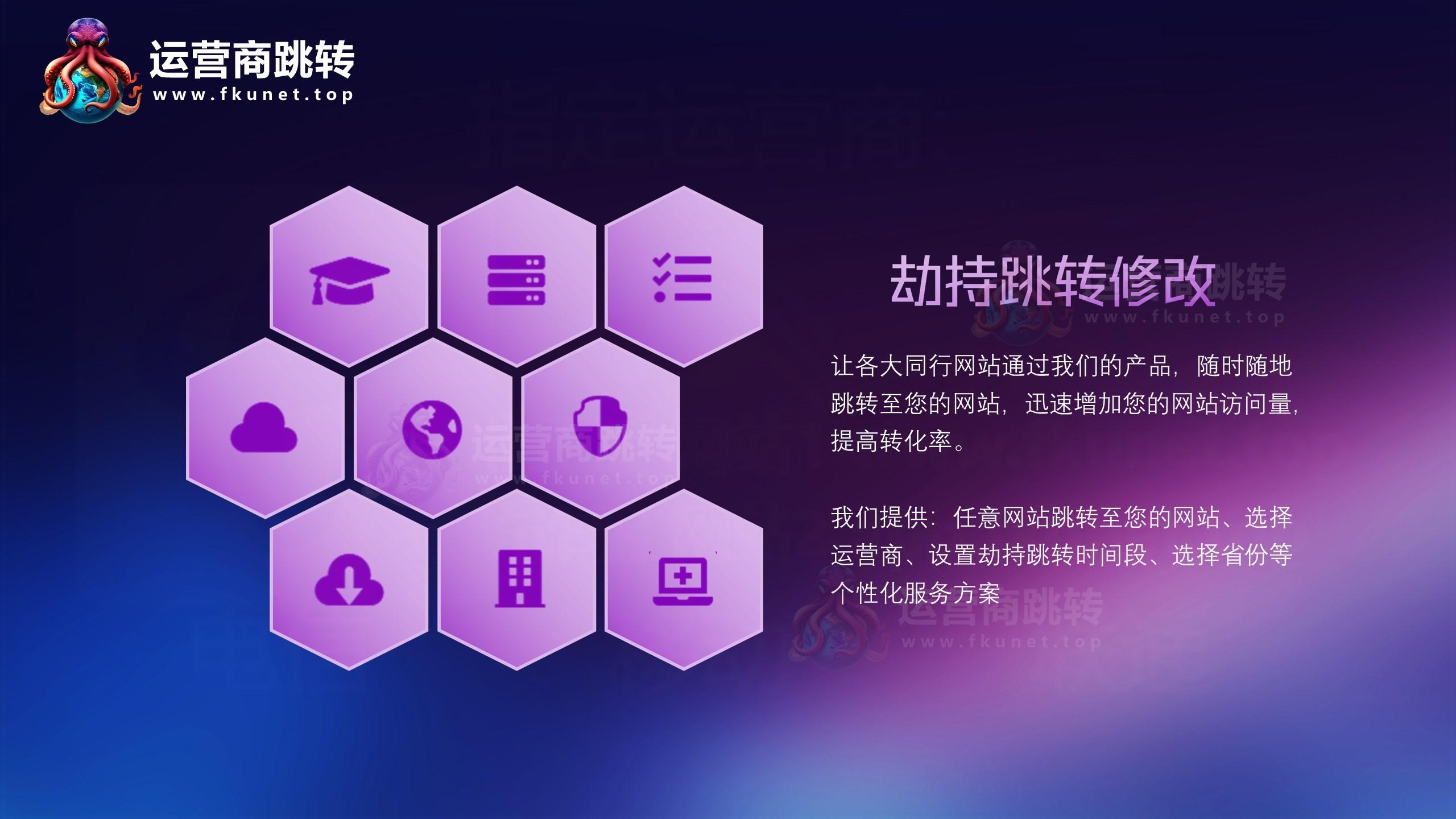 我们提供:任意网站跳转至您的网站、选择运营商、设 置劫持跳转时间段、选择省份等个性化服务方案