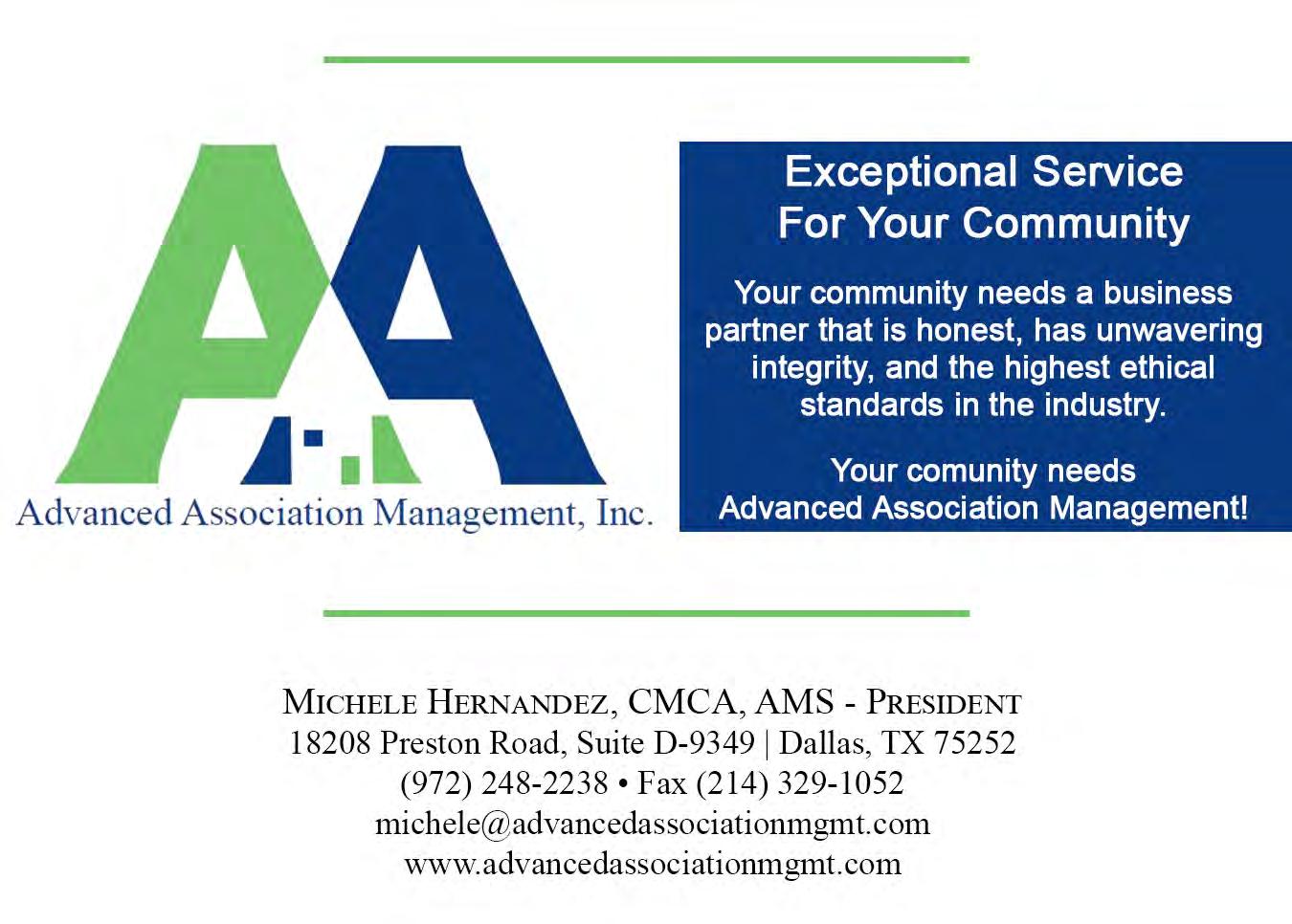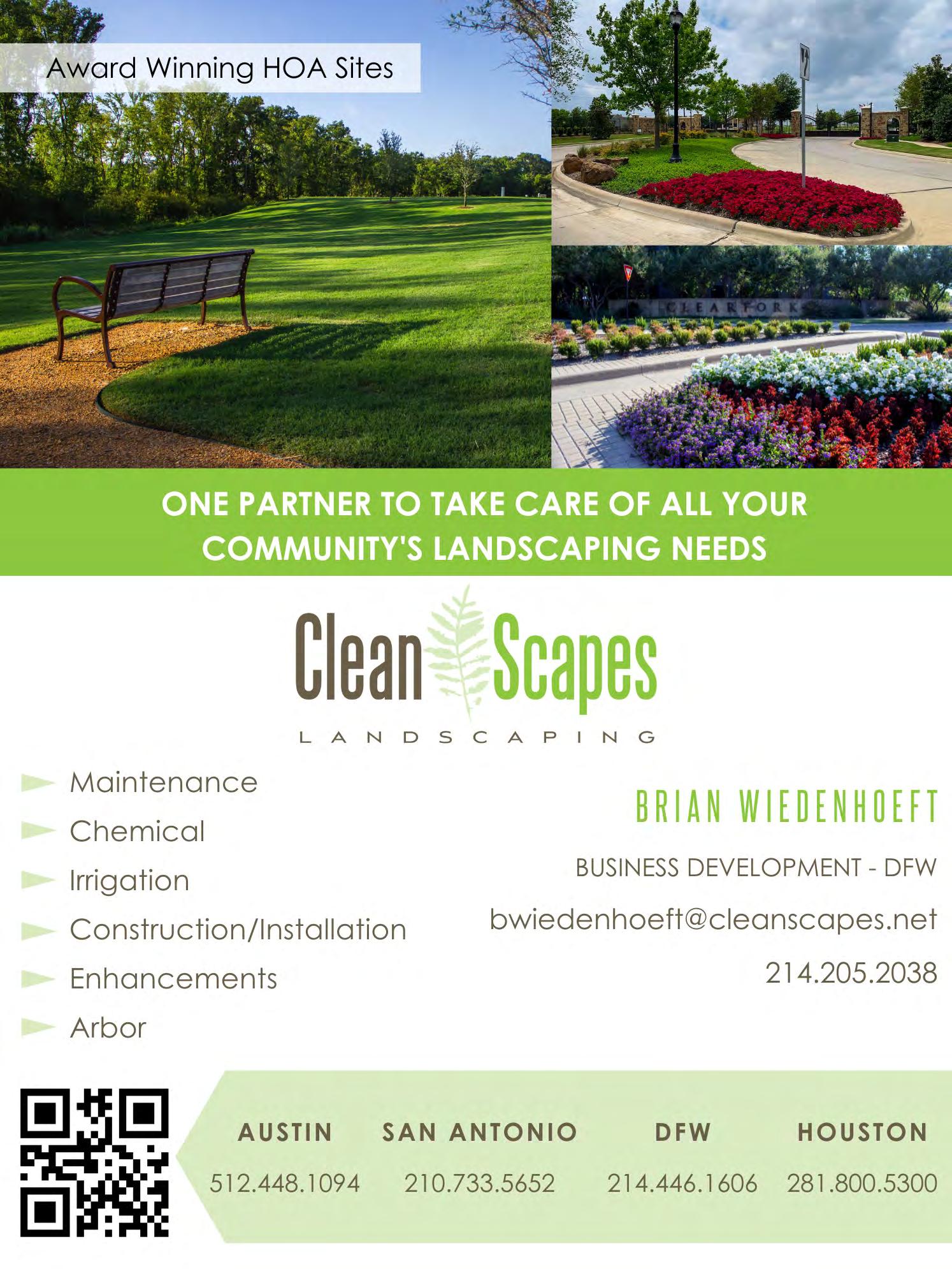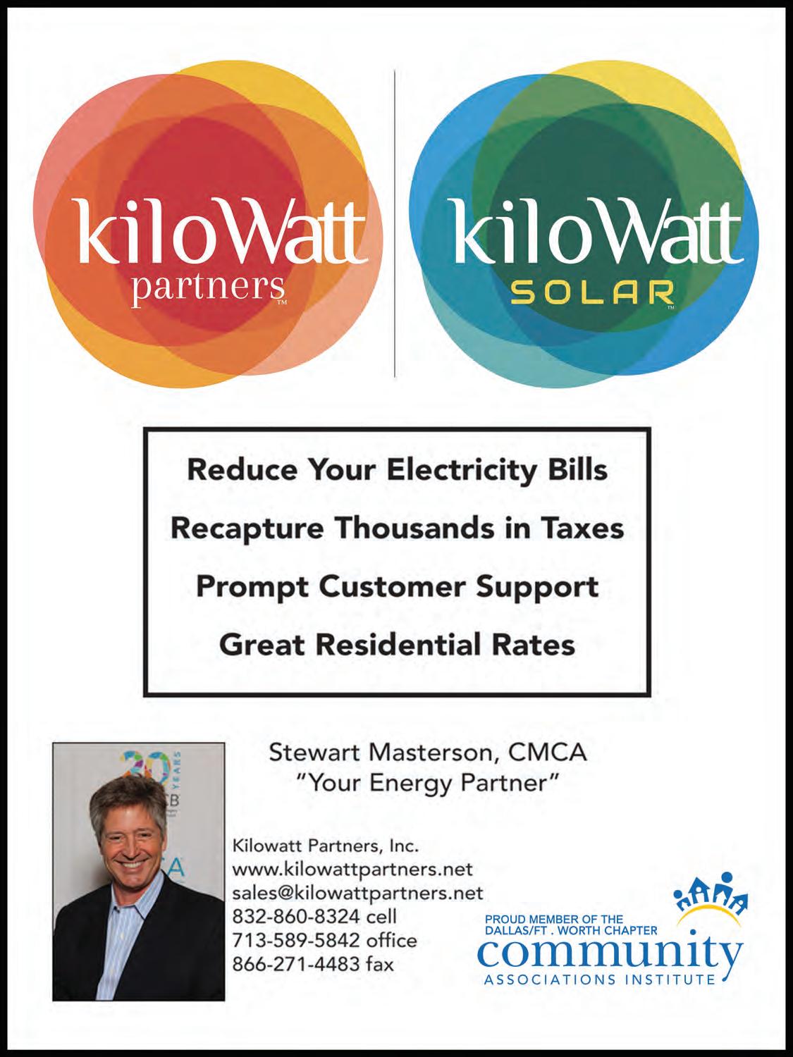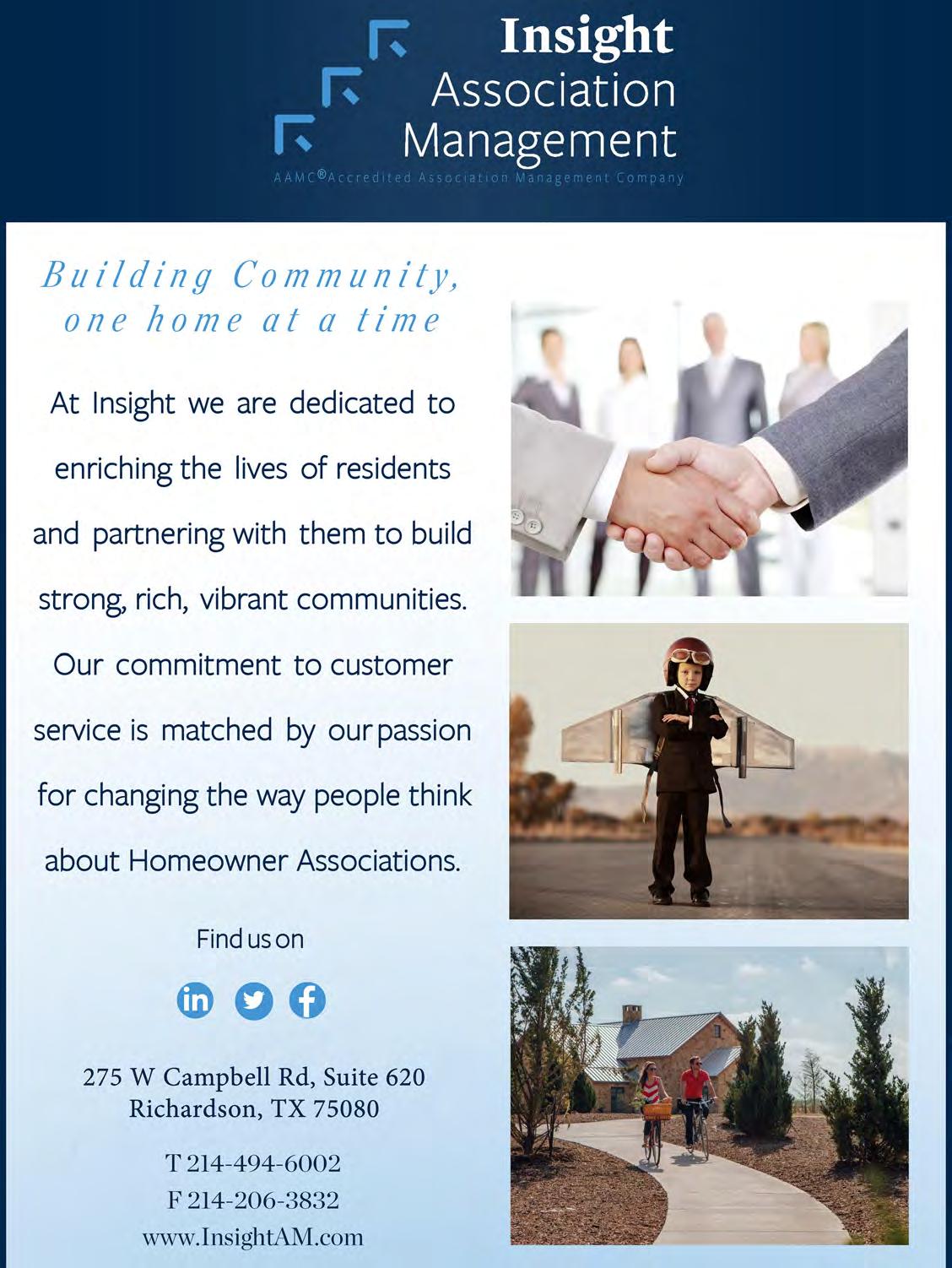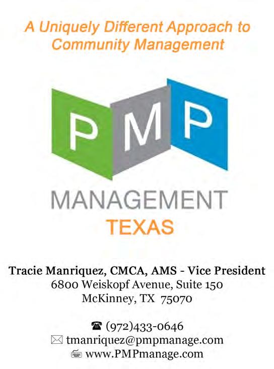 Community Associations Institute is a national, non-profit, membership organization dedicated to the successful creation and operation of community associations. The Dallas/Fort Worth Chapter was established in 1980 to provide support for the North Texas area. Community Contact is published by the Dallas/Fort Worth Chapter of Community Associations Institute and is issued with the understanding that the publisher is not engaged in rendering financial, legal, accounting or other professional services, or be construed as a recommendation for any course of action regarding financial, legal, accounting or other professional services by Community Contact or its authors or advertisers. The services of a competent professional should be sought where professional services are required. The articles appearing in Community Contact do not necessarily reflect the opinion of CAI or the DFW Chapter, and acceptance of advertising does not constitute an endorsement of the products or services.