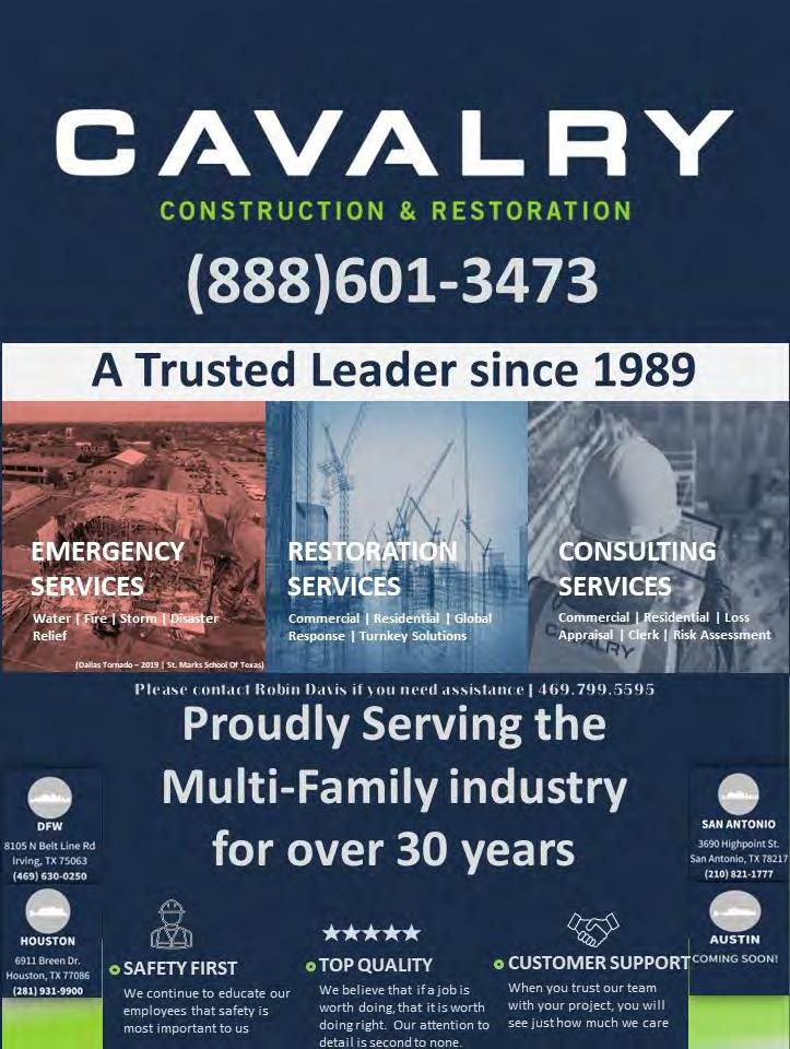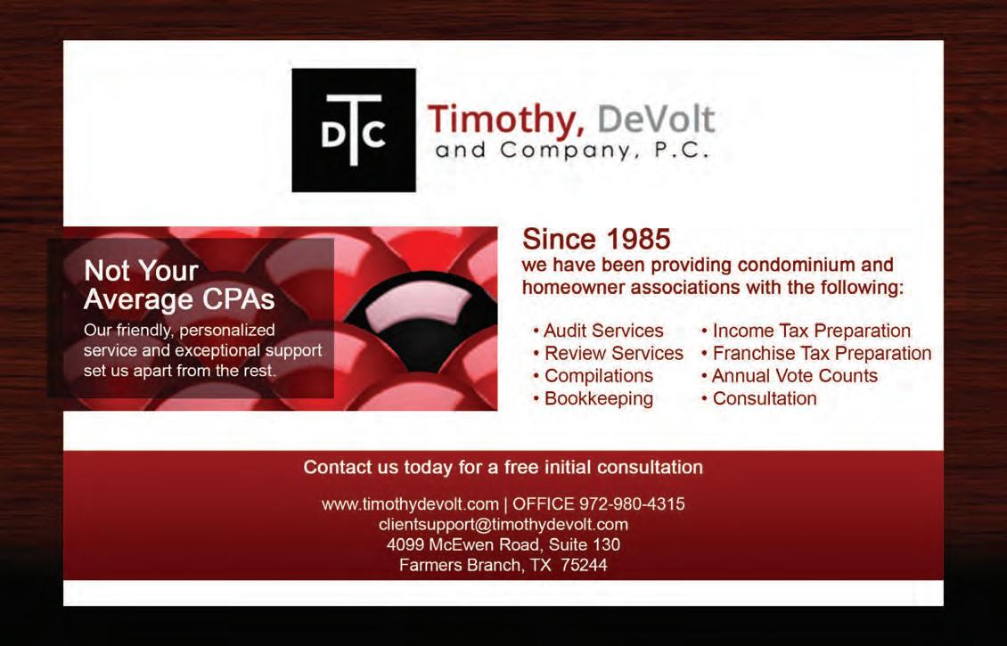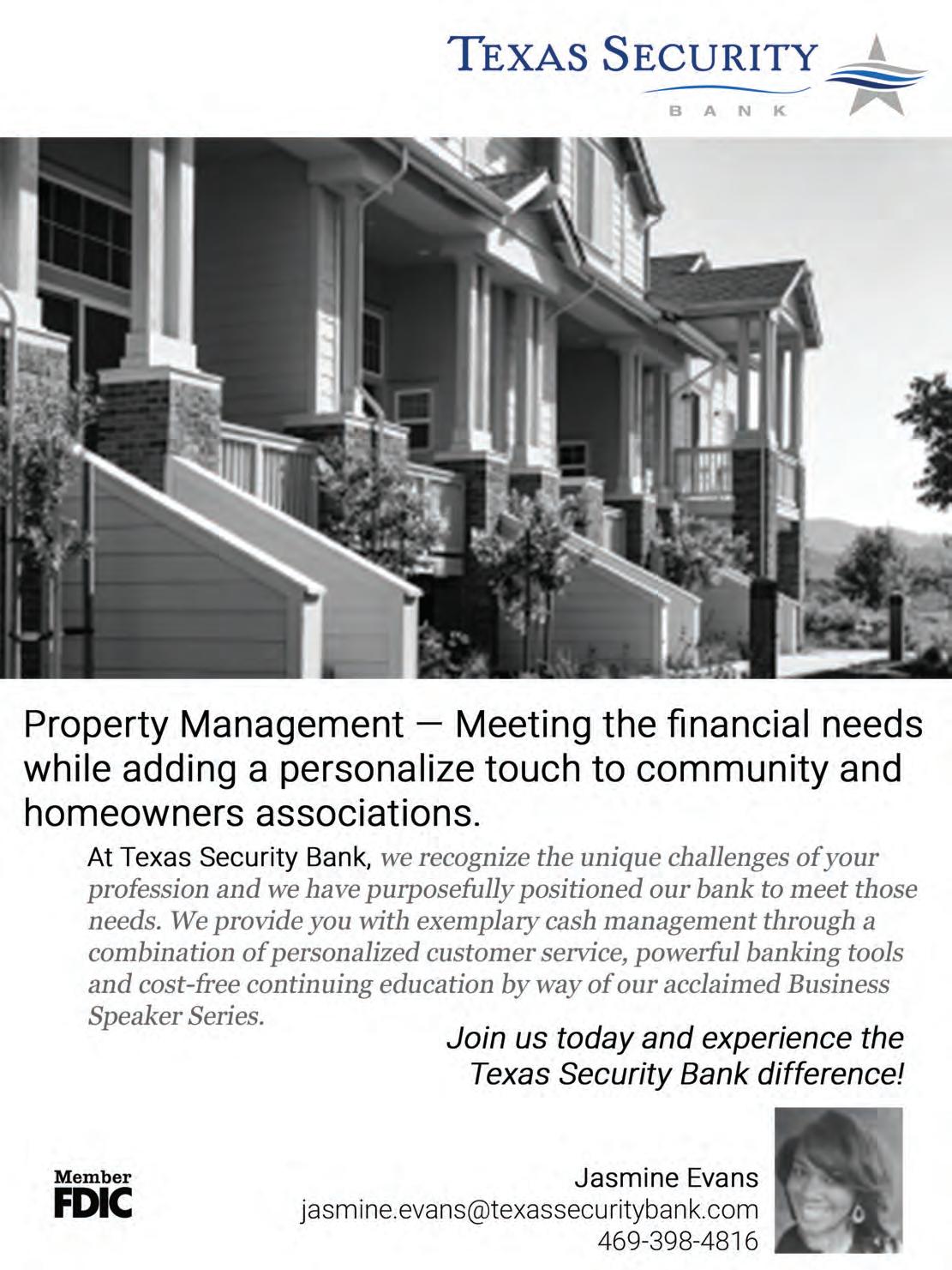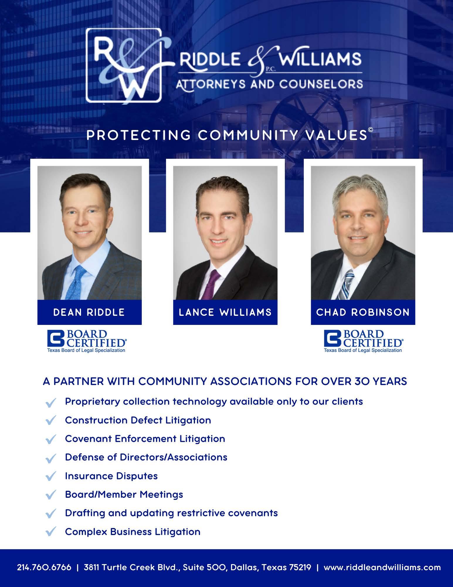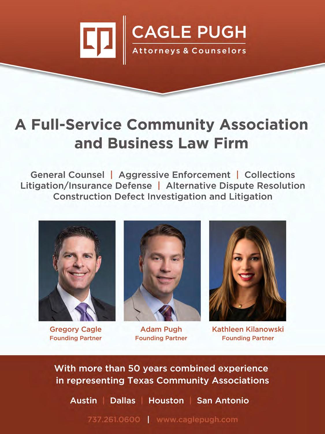Community Associations Institute is a national, non-profit, membership organization dedicated to the successful creation and operation of community associations. The Dallas/Fort Worth Chapter was established in 1980 to provide support for the North Texas area. Community Contact is published by the Dallas/Fort Worth Chapter of Community Associations Institute and is issued with the understanding that the publisher is not engaged in rendering financial, legal, accounting or other professional services, or be construed as a recommendation for any course of action regarding financial, legal, accounting or other professional services by Community Contact or its authors or advertisers. The services of a competent professional should be sought where professional services are required. The articles appearing in Community Contact do not necessarily reflect the opinion of CAI or the DFW Chapter, and acceptance of advertising does not constitute an endorsement of the products or services.