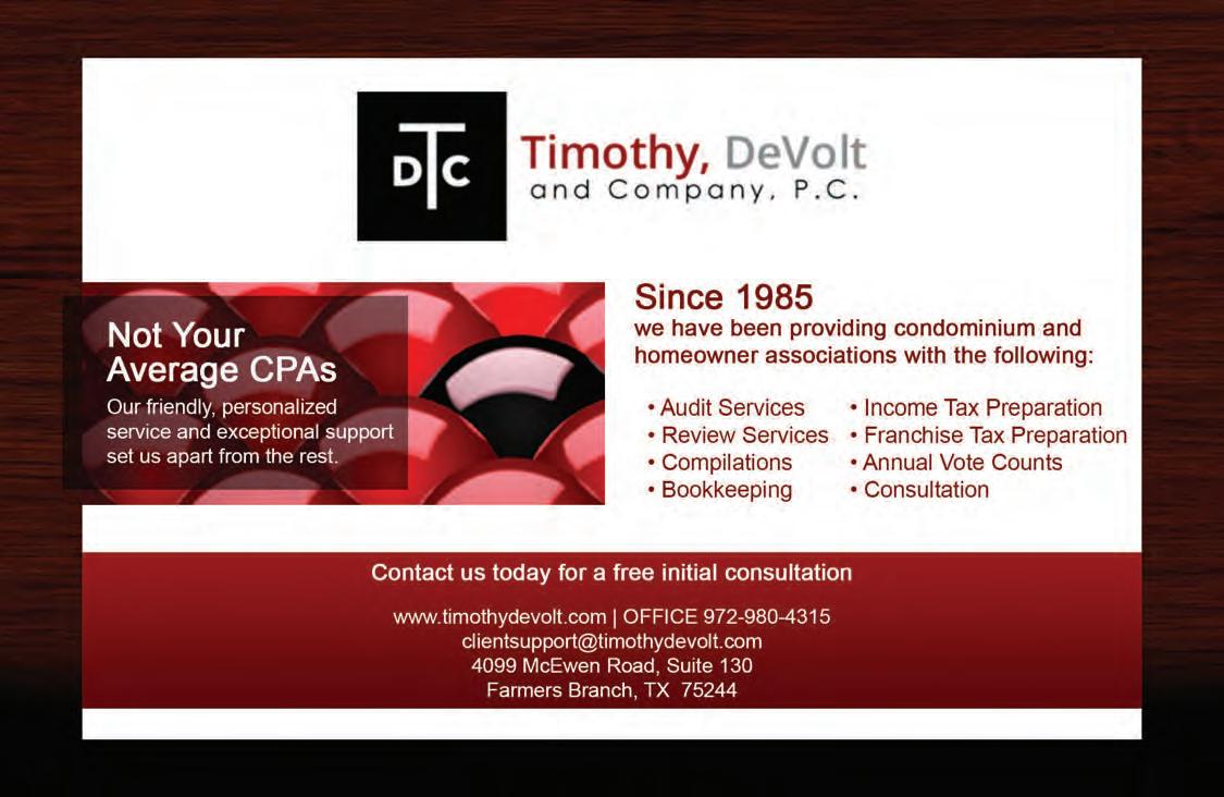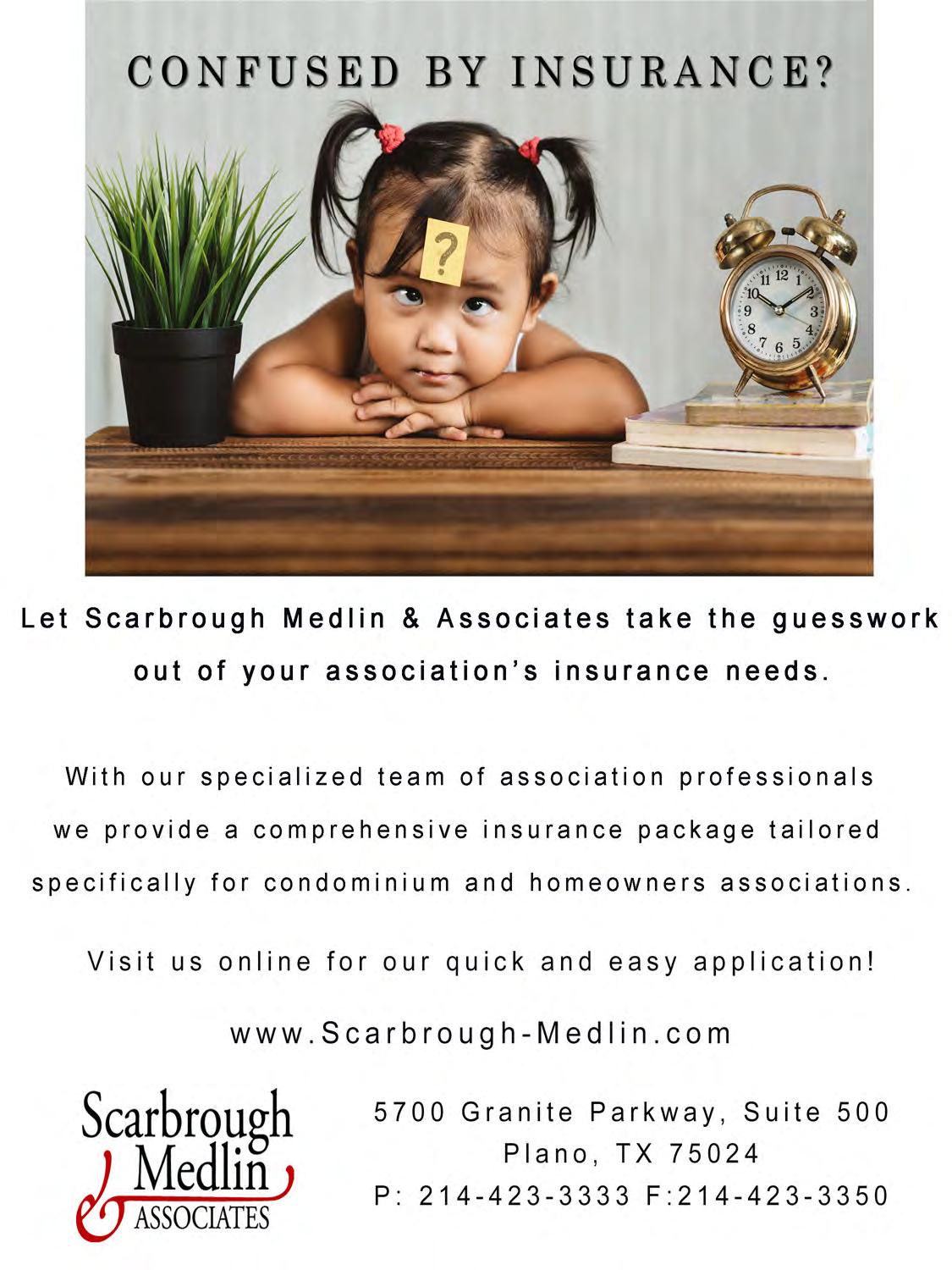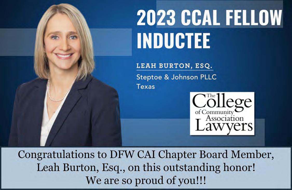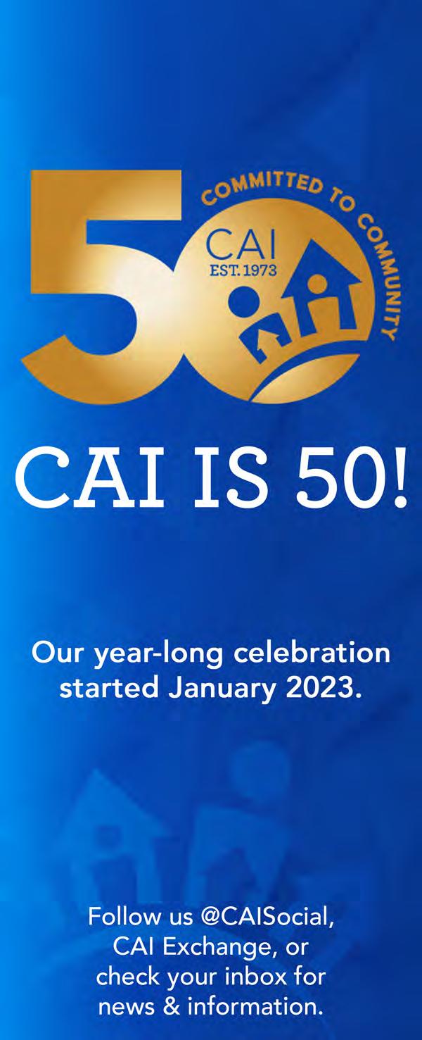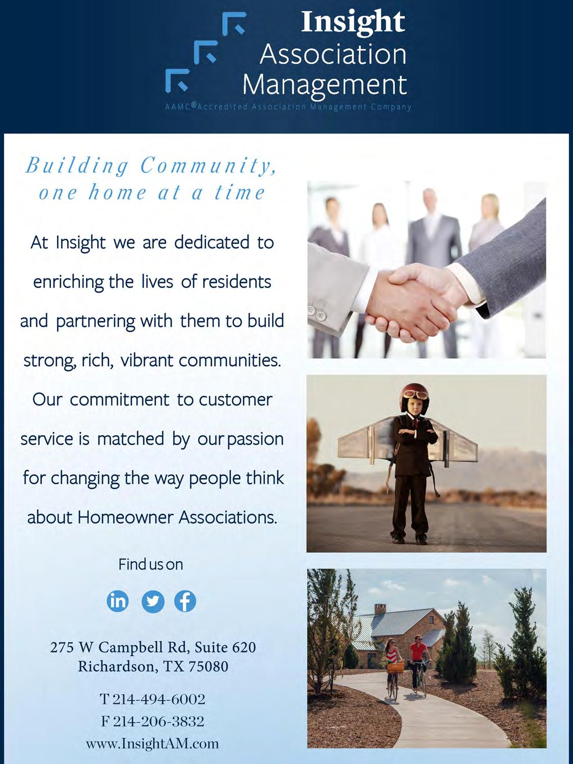 Community Associations Institute is a national, non-profit, membership organization dedicated to the successful creation and operation of community associations. The Dallas/Fort Worth Chapter was established in 1980 to provide support for the North Texas area. Community Contact is published by the Dallas/Fort Worth Chapter of Community Associations Institute and is issued with the understanding that the publisher is not engaged in rendering financial, legal, accounting or other professional services, or be construed as a recommendation for any course of action regarding financial, legal, accounting or other professional services by Community Contact or its authors or advertisers. The services of a competent professional should be sought where professional services are required. The articles appearing in Community Contact do not necessarily reflect the opinion of CAI or the DFW Chapter, and acceptance of advertising does not constitute an endorsement of the products or services. All contents of Community Contact are protected by copyright. Reproduction in whole or in part without written permission is expressly prohibited. AAMC, AMS, and PCAM are registered trademarks of Community Associations Institute. CMCA is a registered trademark of the Community Association Managers International Certification Board. Many of the designations used by manufacturers and sellers to distinguish their products are claimed as trademarks. Use of a term in this publication should not be regarded as affecting the validity of any trademark or service mark. CONTACT Community Sponsors 6 Luncheon Recaps 23 Neighborhood Happenings 24 Bowling Tournament Photos 28 Membership Report 54 Fall 2023 How to Implement a 3-Step Approach 10 TO SAFER NEIGHBORHOODS The Call of Nature: 16 WHY PET OWNERS SHOULD PICK UP AFTER THEIR DOGS Captivating Christmas Light Trends 30 FOR VIBRANT COMMUNITIES How You Can Safeguard Your Community 32 Floral Pop 38 TL AC Summary of the 88th TX Legislation 42 SESSION Navigating Community Association Directors 46 AND OFFICERS CLAIMS
