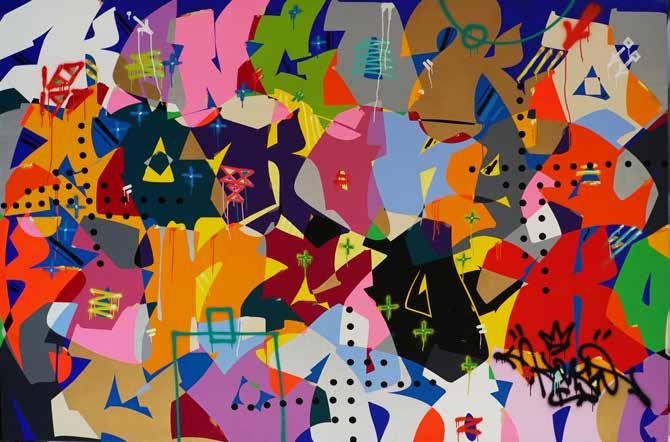 CYRIL KONGO (b. 1969, Toulouse, France). He started doing graffiti as an urban street artist in 1986. In the early years of his practice, he was a solely street artist; he produced large frescoes, whether on walls or other urban constructs, throughout the world. These artworks, which unfortunately can now only be found in photos and film, gained him recognition on the international stage. His twenty years of experience in the French Graffiti scene as a member of the MAC CREW collective allowed him to hone his mastery in this discipline and earned him the title as one of the early representatives of the world’s Graffiti scene; introducing graffiti as a genre.