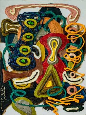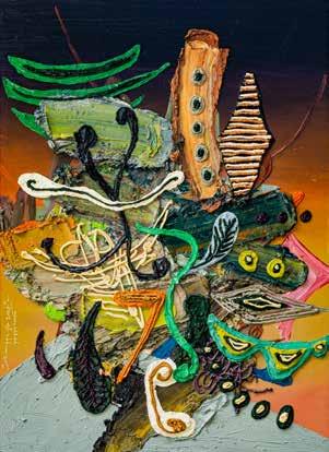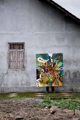 3. Bagaimana cara kamu mengharmonisasi antara bias cahaya, tetumbuhan dan warna-warna bisa saling bersisihan dengan teknik melukis yang digunakan? Saya memulainya dengan struktur awal pada background bergradasi ataupun blok yang berlapis, kemudian diikuti dengan sulur-sulur dan bias cahaya terus berulang namun memiliki ritme hingga lapisan semakin tinggi semakin tebal. Saya menggunakan cat minyak yang dimasukkan ke dalam plastik lalu menekannya dengan perbedaan tekanan dan membentuknya sedemikian rupa, tidak lupa menggunakan campuran warna tersier untuk mencapai kematangan warna pada karya.