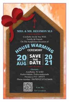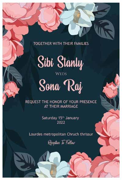 Sona Raj Sibi Stanly & We, Rajan Babu & Sophiamma Joseph Sona Dale, Nanthancode P.O - 695003 Request The Pleasure of Your Presence With Family To Grace The Betrothal of our Beloved Daughter “Therefore a man shall leave his father and S/o (Late) Mr. Stanly Varkey & Mrs. Thangamma Stanly Nedumparambil House, Thrissur P.O - 680651 Which Will by the Grace of God be Solemnized on SUNDAY JANUARY 2022 9TH 4:00 PM ST. THOMAS CHURCH KOKKAMANGALAM Followed by a Formal Reception at 6.00 Pm, KTDC Waterscapes, Kumarakom Sharing The Happiness: Kith and Kin Ph: +91 9446176155, 8281769636 Scan For Location
