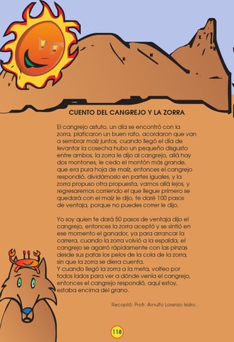 CUENTO DEL CANGREJO Y LA ZORRA El cangrejo astuto, un día se encontró con la zorra, platicaron un buen rato, acordaron que van a sembrar maíz juntos, cuando llegó el día de levantar la cosecha hubo un pequeño disgusto entre ambos, la zorra le dijo al cangrejo, allá hay dos montones, le cedo el montón más grande, que era pura hoja de maíz, entonces el cangrejo respondió, dividámoslo en partes iguales, y la zorra propuso otra propuesta, vamos allá lejos, y regresaremos corriendo el que llegue primero se quedará con el maíz le dijo, te daré 100 pasos de ventaja, porque no puedes correr le dijo. Yo soy quien te dará 50 pasos de ventaja dijo el cangrejo, entonces la zorra aceptó y se sintió en ese momento el ganador, ya para arrancar la carrera, cuando la zorra volvió a la espalda, el cangrejo se agarró rápidamente con las pinzas desde sus patas los pelos de la cola de la zorra, sin que la zorra se diera cuenta. Y cuando llegó la zorra a la meta, volteo por todos lados para ver a dónde venía el cangrejo, entonces el cangrejo respondió, aquí estoy, estaba encima del grano. Recopiló: Profr. Arnulfo Lorenzo Isidro.