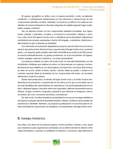 Programas de estudio 2011 / Guía para el Maestro Primaria / Primer grado El espacio geográfico se define como el espacio percibido, vivido, socialmente construido y continuamente transformado por las relaciones e interacciones de sus componentes naturales, sociales, culturales, económicos y políticos, los cuales se ma nifiestan de manera integrada en diversas categorías de análisis espacial: lugar, medio, región, paisaje y territorio. Así, los alumnos inician con los componentes naturales (montañas, ríos, lagos, mares, plantas y animales), sociales y económicos (comunidad, trabajos y servi cios, entre otros) del espacio donde viven, e identifican que la diversidad cultural tiene manifestaciones propias expresadas a través del lenguaje, costumbres, tradiciones y sitios históricos que conforman su identidad. Con esta base en la presente asignatura se propone que los niños reconozcan su espacio apoyados en las observaciones y experiencias del lugar donde viven, en primer grado, y en segundo grado amplíen esta visión al identificar su medio local. Esto permi te avanzar sistemáticamente, en grados posteriores, en el reconocimiento de lugares, medios, paisajes, regiones y territorios, con mayor profundidad. Los alumnos amplían su visión del medio local, el cual está determinado por las actividades cotidianas que realizan los niños con las personas con quienes conviven, las relaciones que establecen con otros lugares y los trayectos conocidos. Esto incluye su radio de acción, desde el barrio, rancho, colonia, hasta su pueblo o ciudad en el contexto nacional. Dada la diversidad de los componentes del medio, es necesario diferenciar lo rural de lo urbano. Desde esta perspectiva, el estudio del lugar donde viven y el medio local se fun damenta en la percepción y experiencias de los niños, por lo que es necesario que el docente identifique las características de cada alumno, los ayude gradualmente a loca lizar y distinguir lugares; descubrir relaciones espaciales; elaborar representaciones en dibujos, croquis, modelos y maquetas; expresar lo que observan en imágenes, videos, recorridos, así como comunicar sus ideas y conclusiones. De este modo, los niños tendrán la oportunidad de reconocer los rasgos distintivos del espacio local para valorar la diversidad natural y cultural, y fortalecer así su sentido de pertenencia e identidad. Asimismo, se propicia su participación en acciones para el cui dado del ambiente, la prevención de desastres y el mejoramiento del lugar donde viven.