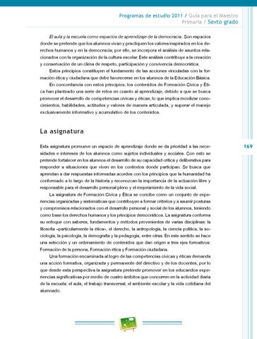 Programas de estudio 2011 / Guía para el Maestro Primaria / Sexto grado El aula y la escuela como espacios de aprendizaje de la democracia. Son espacios donde se pretende que los alumnos vivan y practiquen los valores inspirados en los derechos humanos y en la democracia; por ello, se incorpora el análisis de asuntos relacionados con la organización de la cultura escolar. Este análisis contribuye a la creación y conservación de un clima de respeto, participación y convivencia democrática. Estos principios constituyen el fundamento de las acciones vinculadas con la formación ética y ciudadana que debe favorecerse en los alumnos de la Educación Básica. En concordancia con estos principios, los contenidos de Formación Cívica y Ética han planteado una serie de retos en cuanto al aprendizaje, debido a que se busca promover el desarrollo de competencias cívicas y éticas, lo que implica movilizar conocimientos, habilidades, actitudes y valores de manera articulada, y superar el manejo exclusivamente informativo y acumulativo de los contenidos.