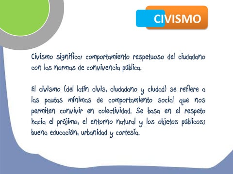 CIVISMO Civismo significa: comportamiento respetuoso del ciudadano con las normas de convivencia pública. El civismo (del latín civis, ciudadano y ciudad) se refiere a las pautas mínimas de comportamiento social que nos permiten convivir en colectividad. Se basa en el respeto hacia el prójimo, el entorno natural y los objetos públicos; buena educación, urbanidad y cortesía.