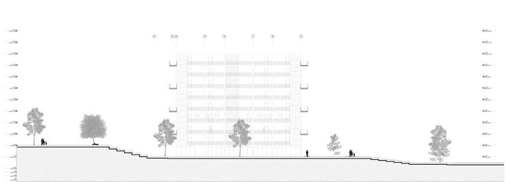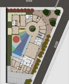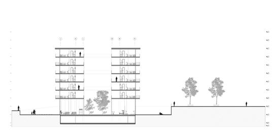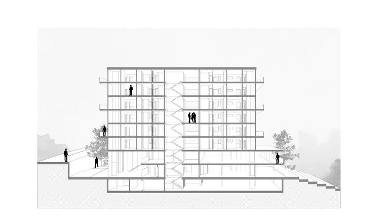 El proyecto mismo se compone de una serie de pisos que van escalonados para así obtener mejores vistas al río Fucha, el proyecto se compone en primera planta por una serie de espacios destinados para el barrio, a partir del segundo piso los espacios son exclusivos para los residentes.