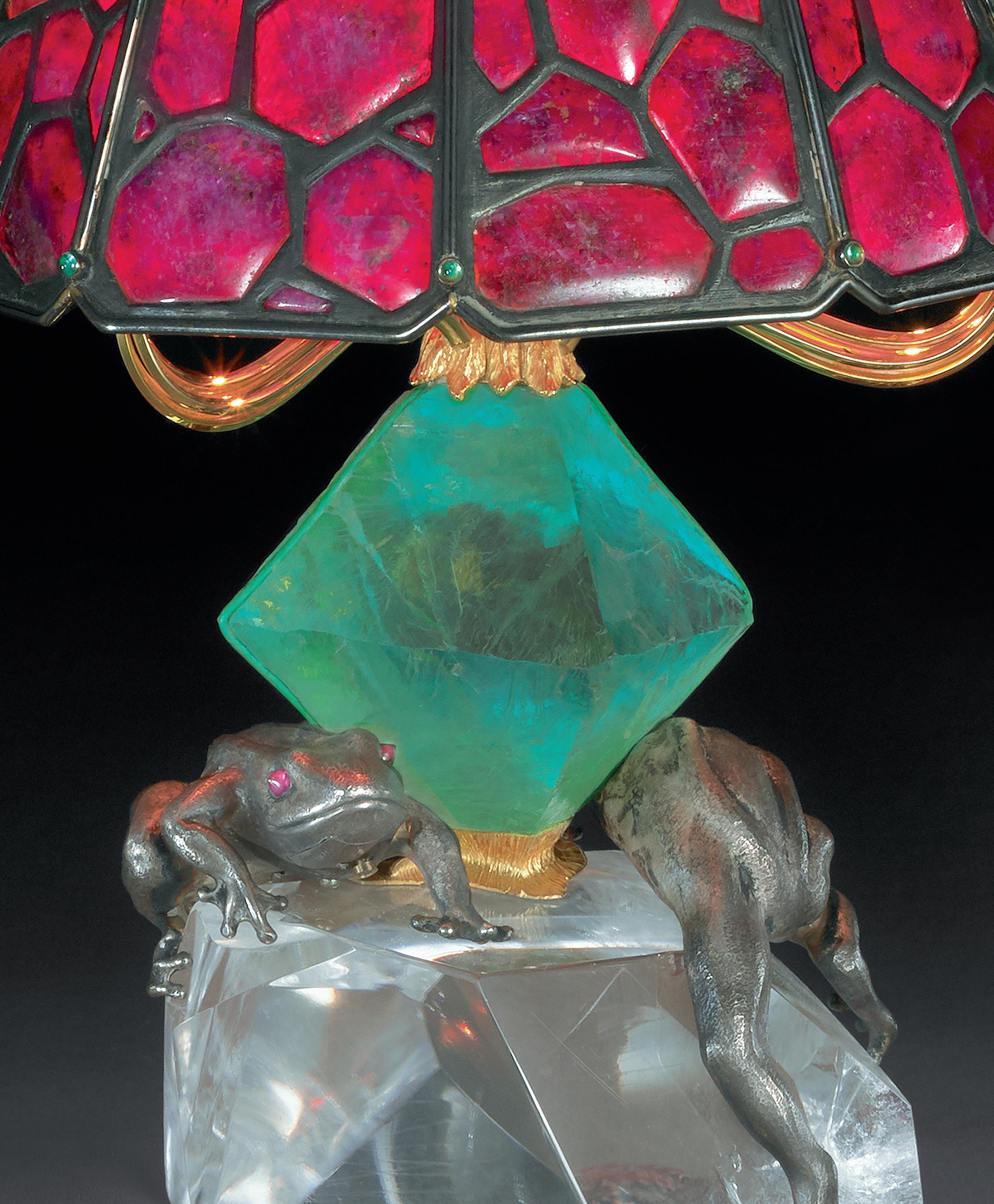 Lamp with carved agate abat-jour (shade) and obsidian base supported on nine enameled frogs, all with cabochon ruby eyes; swiveling arm set with 88 Frenchbuffed and cabochon rubies, and 72 diamonds. Switch is cut flush at back edge of base.