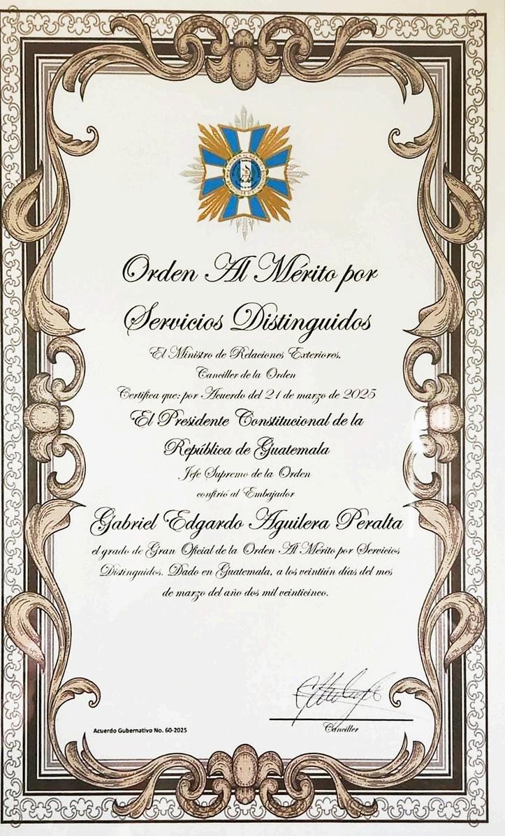 Esta publicación trata del Embajador Gabriel Edgardo Aguilera Peralta, quien recibió la Orden Al Mérito por Servicios Distinguidos en el grado de Gran Oficial por 62 años dedicados a trabajar por los intereses de Guatemala, es reconocido por ser un profesional diligente en las misiones diplomáticas acompañadas de una política exterior eficaz adaptada a las situaciones globales que evolucionan, tal como ese Quijote que siempre enfrentó los molinos de viento no con argumentos exigentes, sino con evocar la negociación basada en estrategias prevaleciendo el diálogo, el justo remedio para la conciliación.