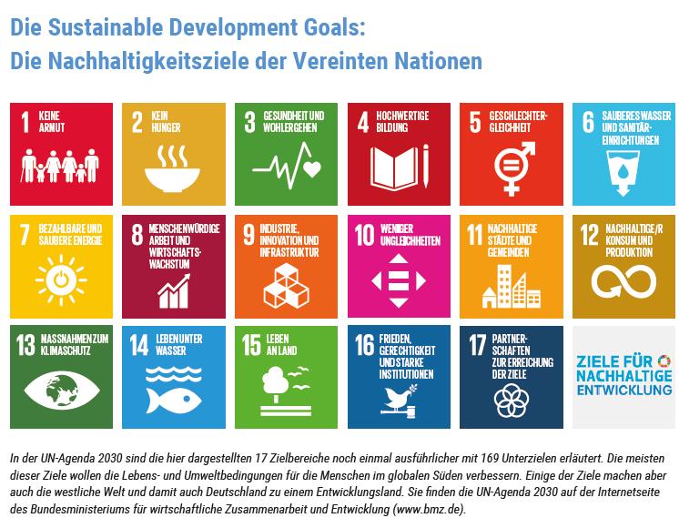 Dafür wurden 17 Ziele für eine nachhaltige Entwicklung erarbeitet, die sogenannten Sustainable Development Goals (SDGs). Sie sollen als Orientierungshilfe für eine nachhaltige Handlungsweise gelten. Sie stellen ganzheitlich alle Facetten sozialer, ökologischer und ökonomischer Nachhaltigkeit dar und bieten eine einheitliche Kommunikations und Handlungsplattform für Wirtschaftsakteure jeglicher Herkunft. Die SDG’s bieten für die Wirtschaft Leitlinien und Checkpunkte für nachhaltiges Handeln. Es gibt 169 Unterziele mit eindeutigen Kennzahlen.