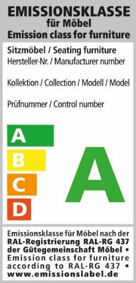 An emission label provides the consumer with information on pollutant emissions and is intended to protect the consumer from detrimental health effects. The emission label developed by the Deutsche Gütegemeinschaft Möbel e. V. refers to a collection / a model and is attached directly to the product/s. Proof of classification is based on appropriate pollutant tests, and the label is awarded exclusively by the Deutsche Gütegemeinschaft Möbel e. V.