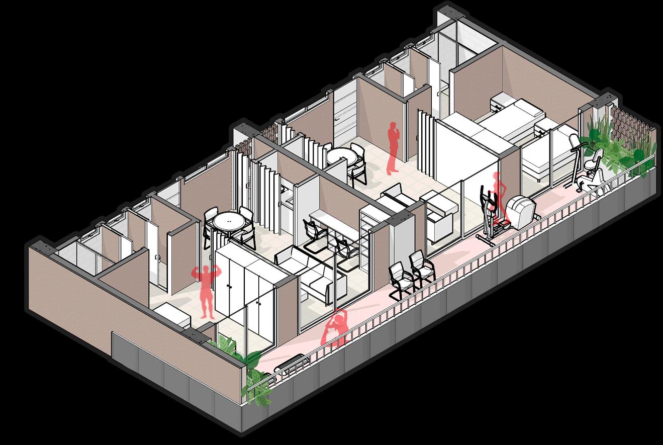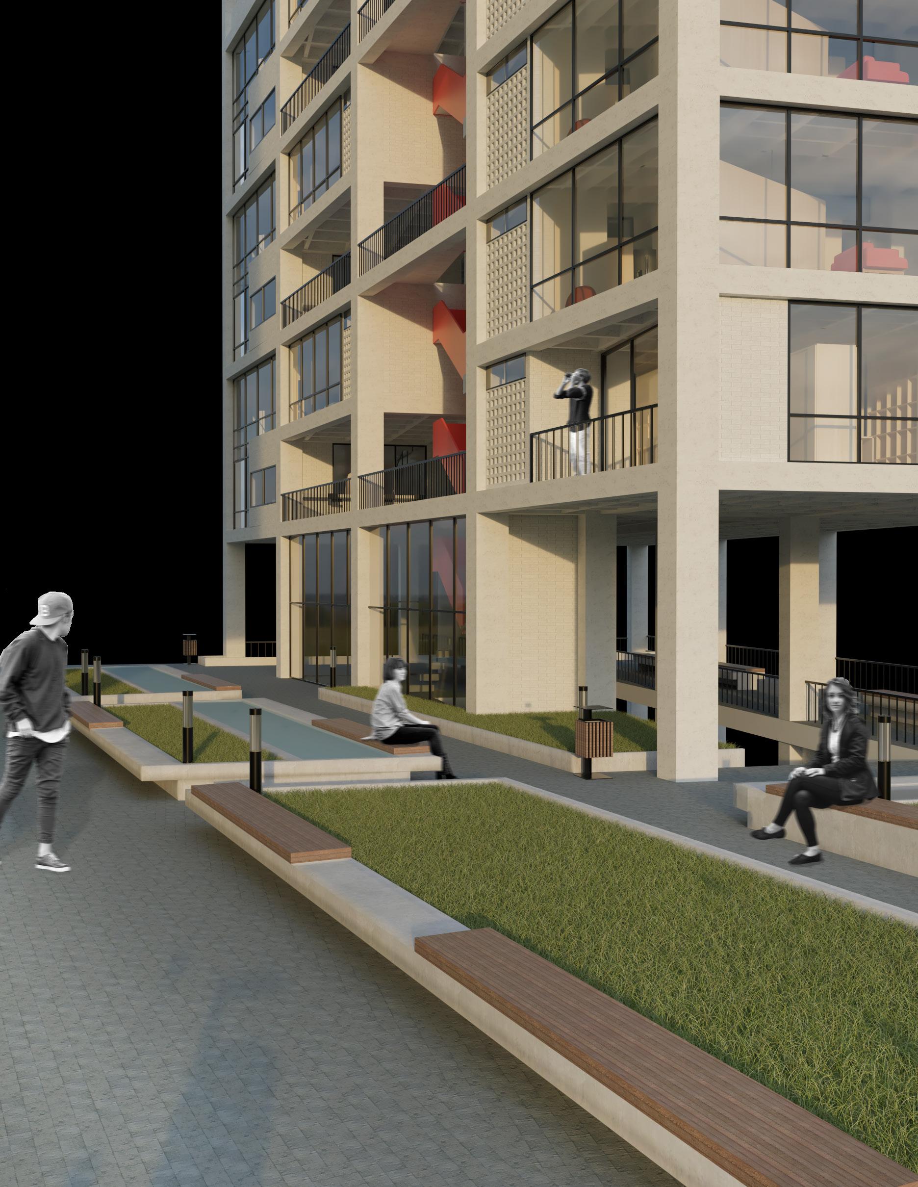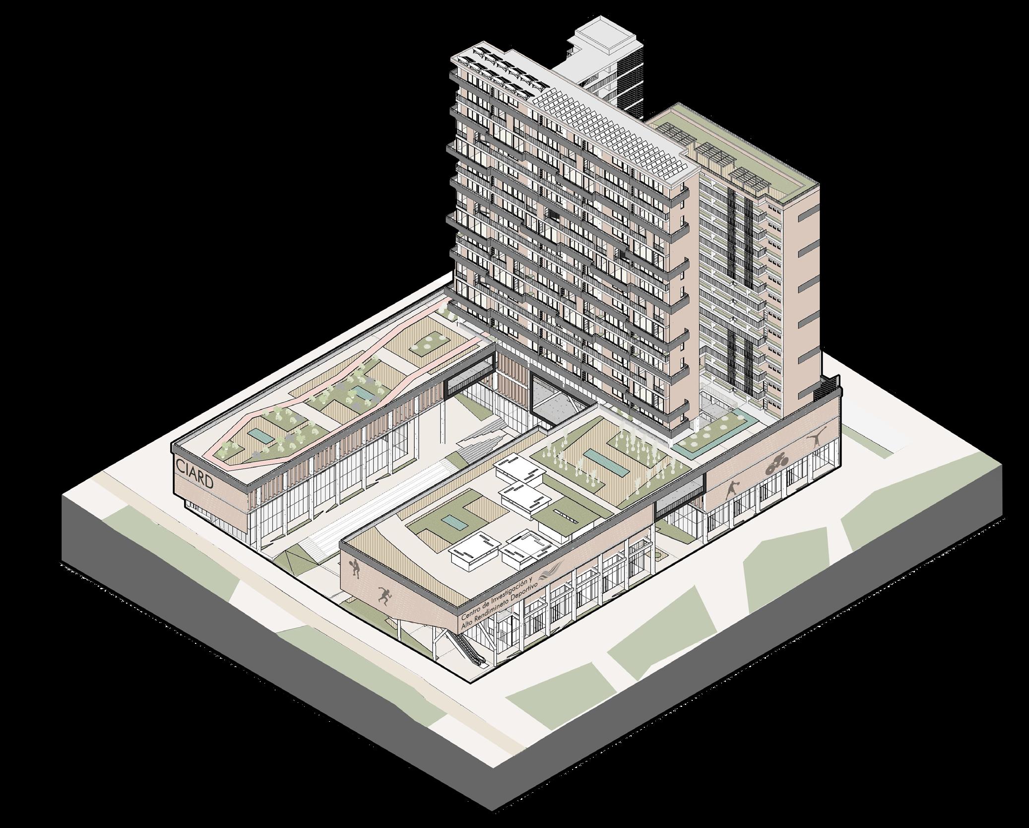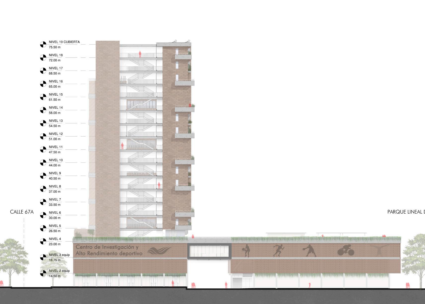 Es así cómo se constituye una plataforma de servicios en la cual se ubica un centro de alto rendimiento deportivo con dos torres de vivienda social fija y temporal, donde los corredores abiertos buscan mejorar el confort al interior de los apartamentos al garantizar condiciones tales como ventilación cruzada, iluminación natural, privacidad y posibilidad de encuentro e interelación vecinal.
