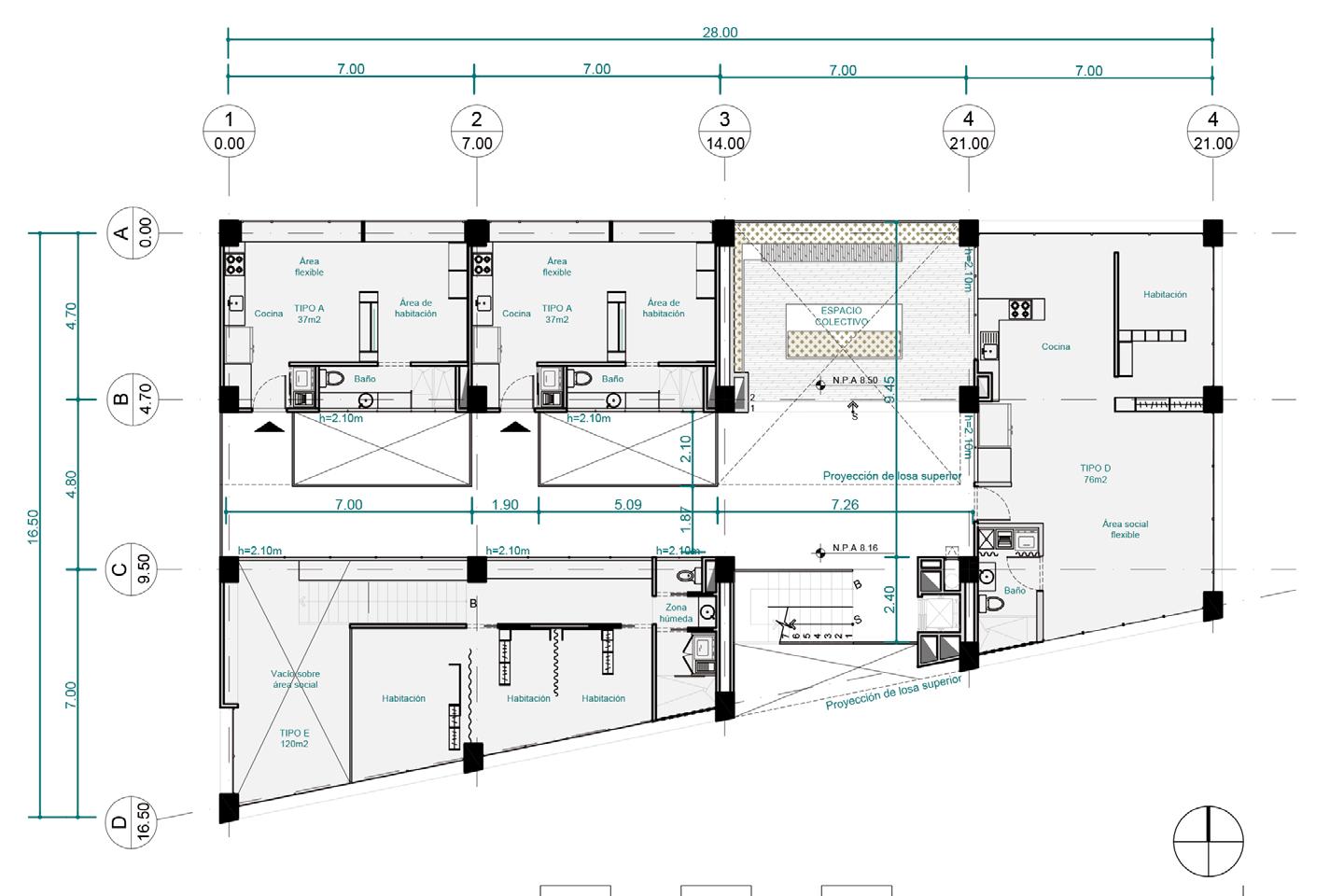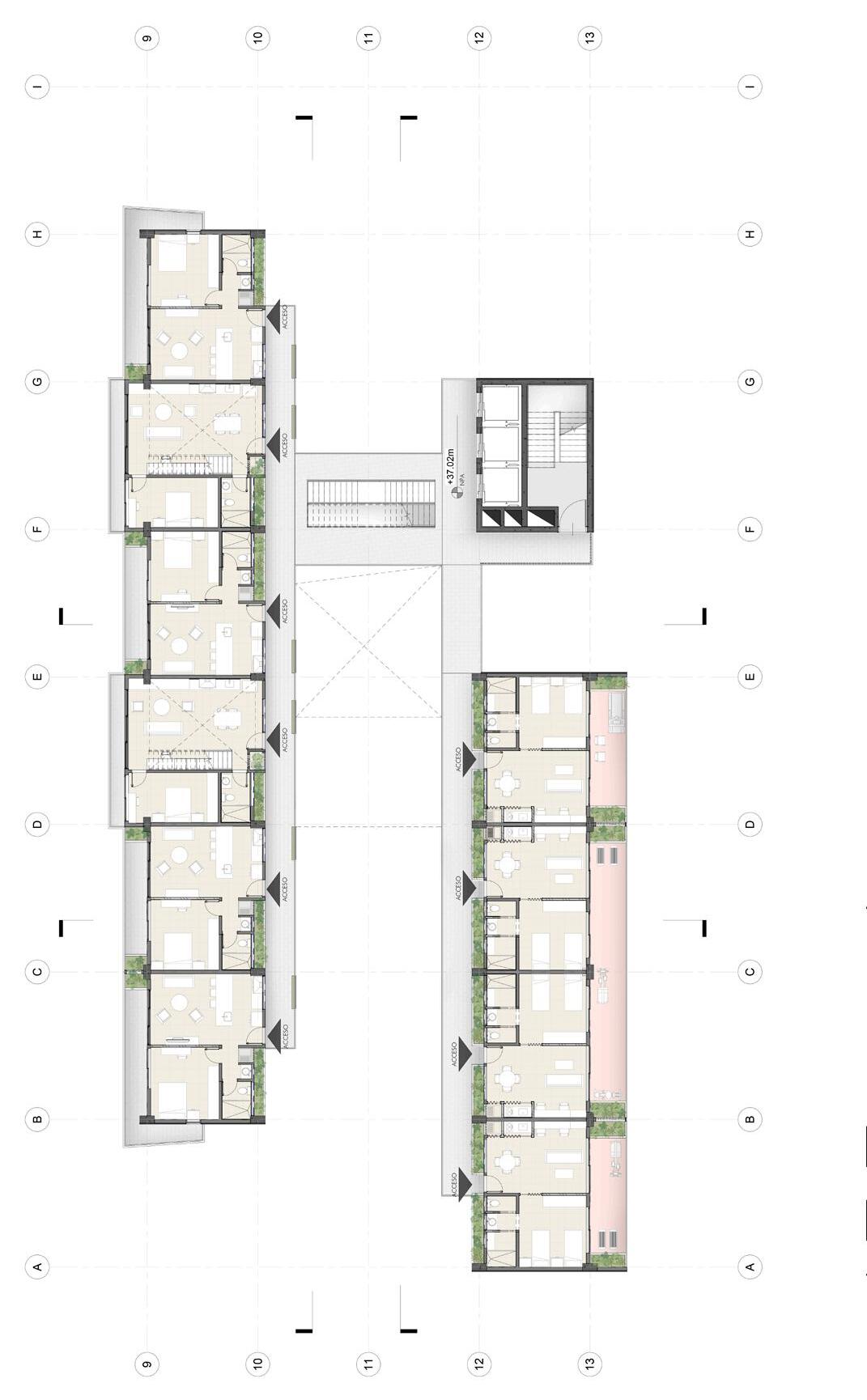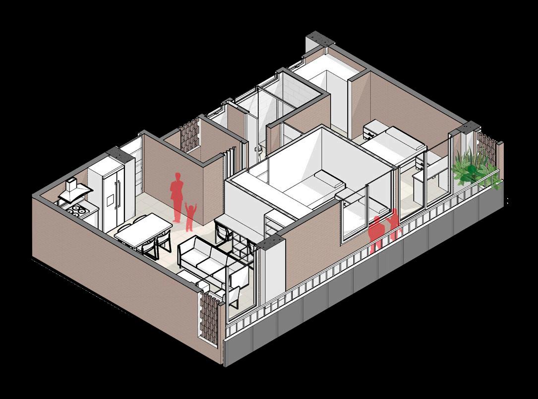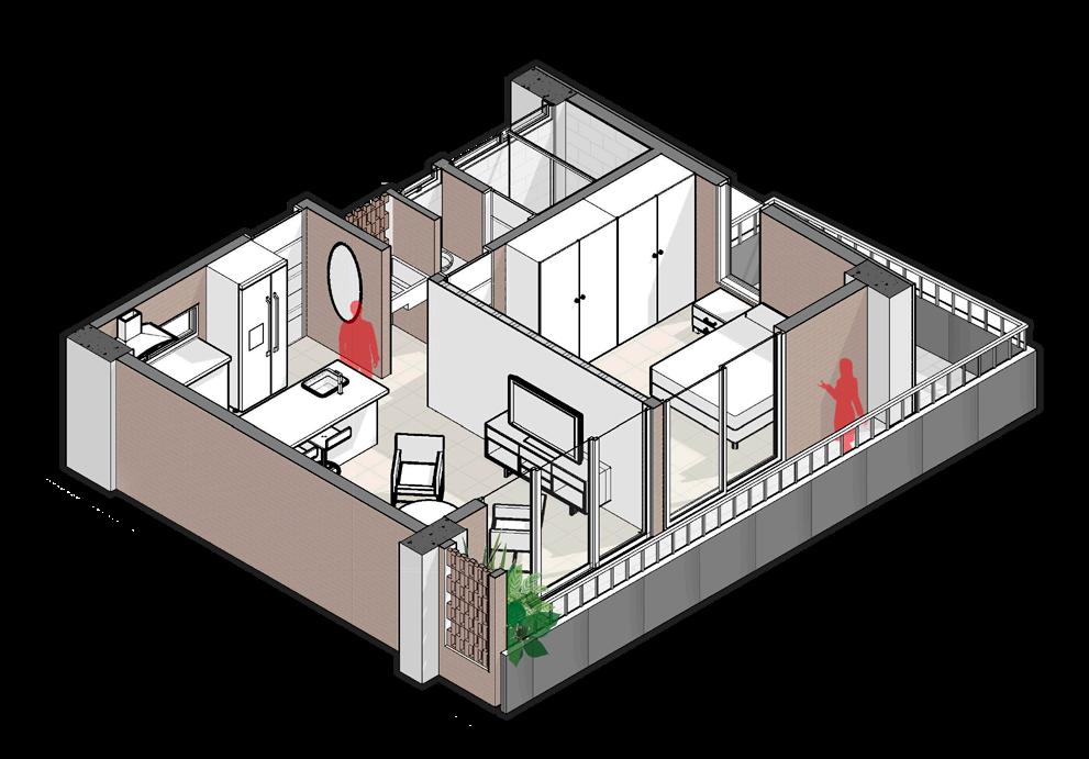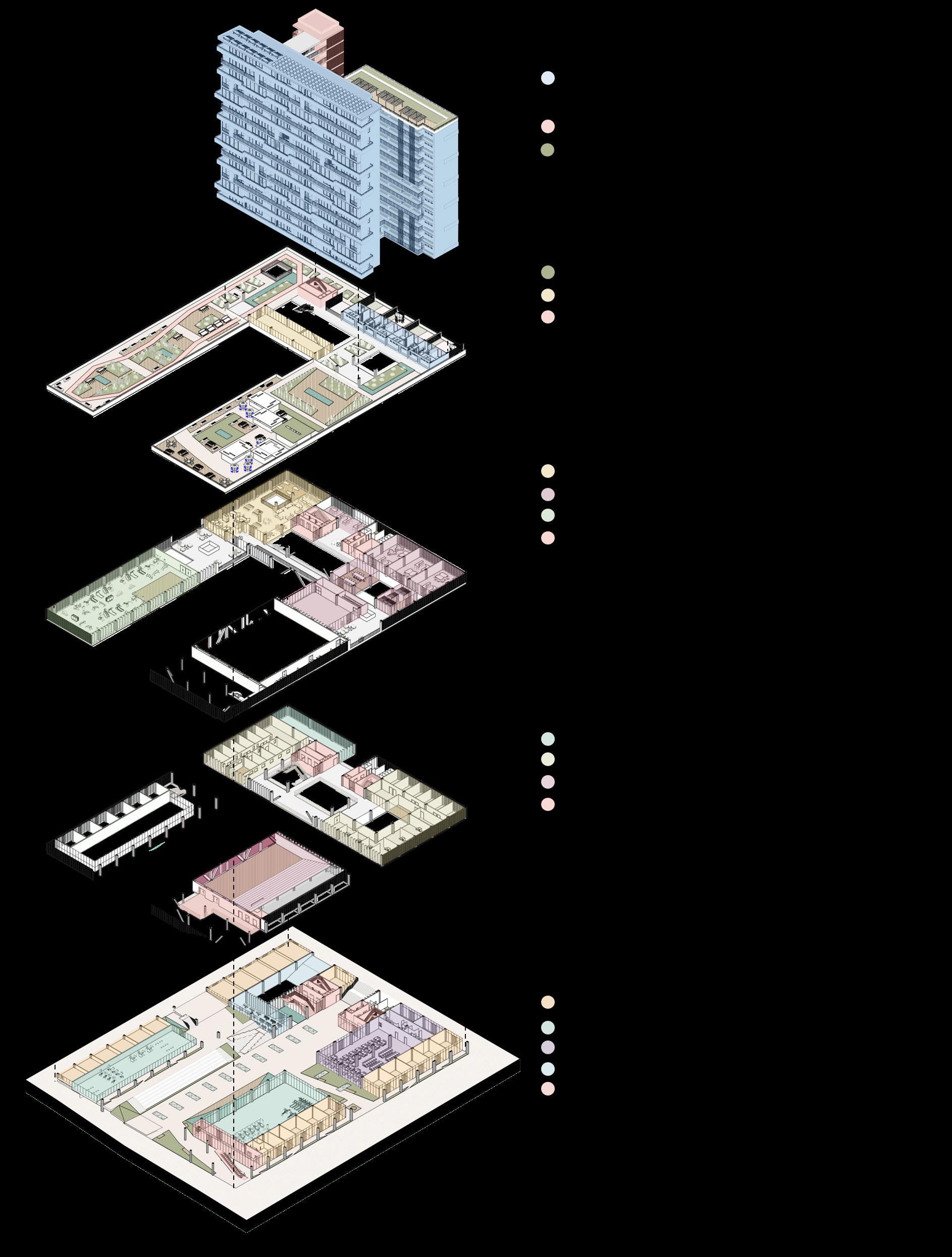 Es así cómo se constituye una plataforma de servicios en la cual se ubica un centro de alto rendimiento deportivo con dos torres de vivienda social fija y temporal, donde los corredores abiertos buscan mejorar el confort al interior de los apartamentos al garantizar condiciones tales como ventilación cruzada, iluminación natural, privacidad y posibilidad de encuentro e interelación vecinal.