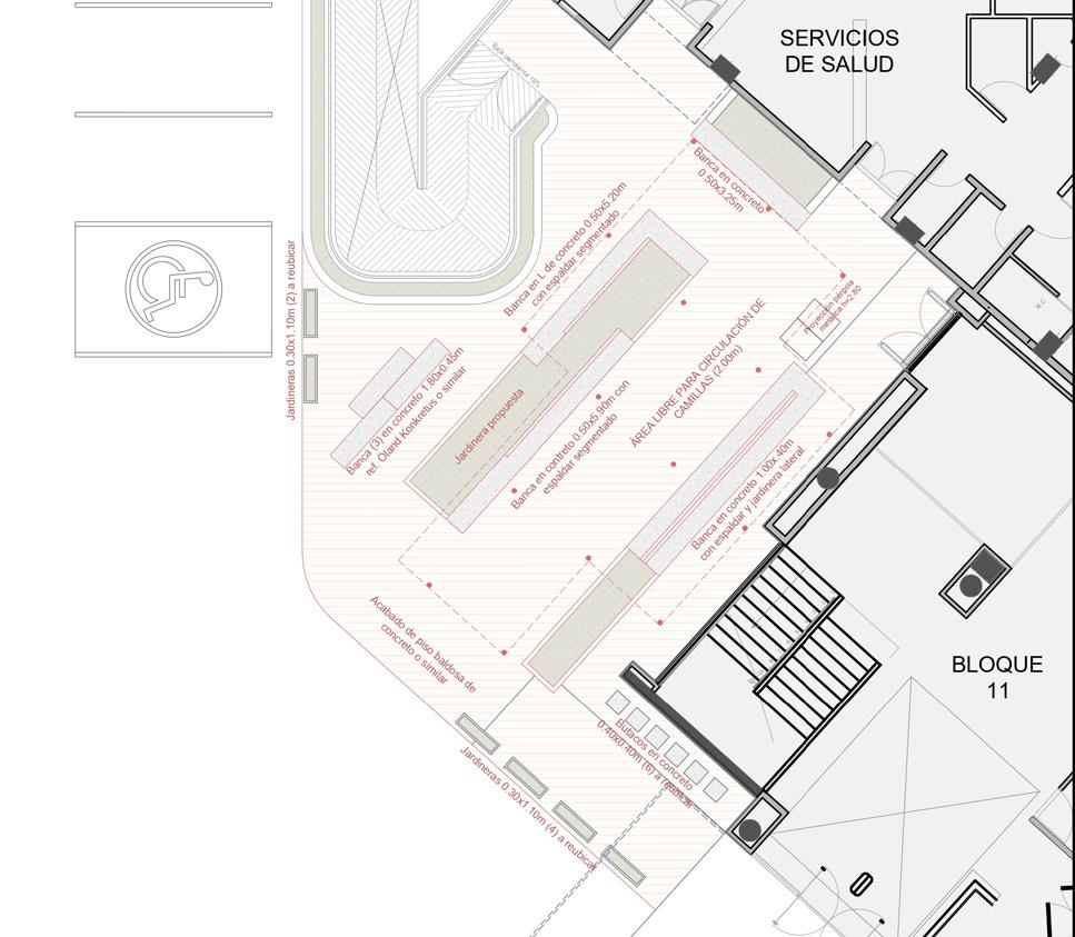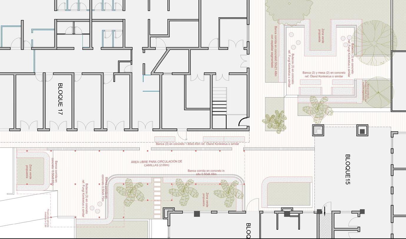 La propuesta se concibe como una solución a la falta de espacios de estancia y descando al interior del Complejo Hospitalario, tomando como referencia el “Concurso Público para el Complejo Hospitalario San Juan de Dios” en Bogotá.
