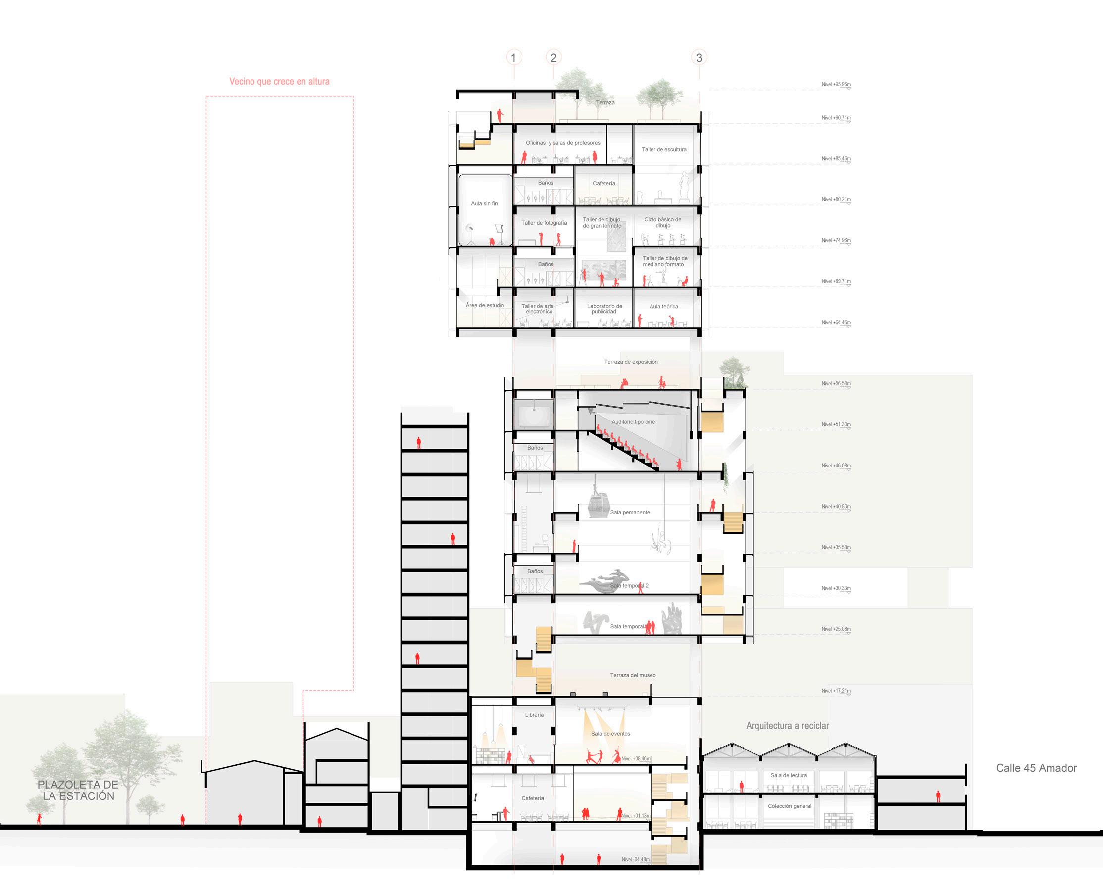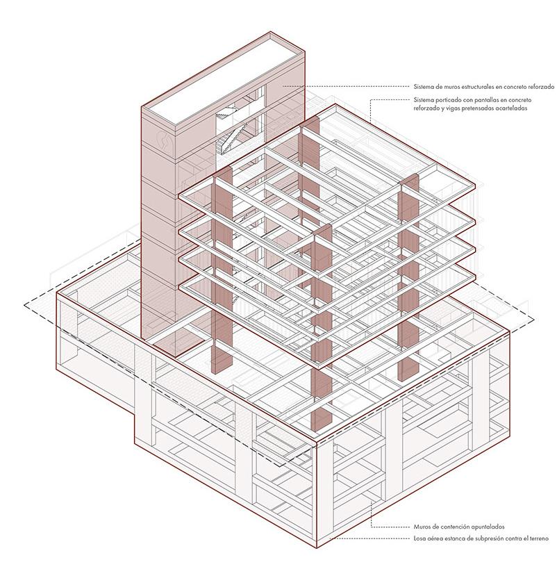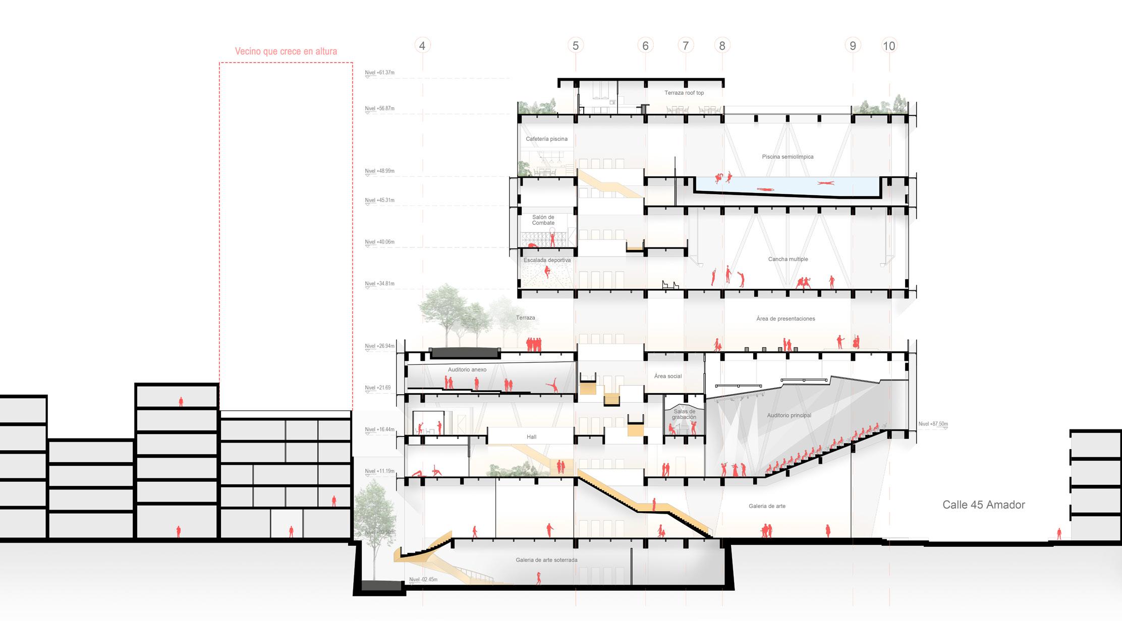 Se proponen dos torres relacionadas a partir de un patio central de carácter público que permite activar el centro de manzana y extender el primer piso hacia los niveles superiores. De este modo, se conforma una circulación vertical pública que atraviesa una galería, una sala de baile, un museo, una escuela de artes, una casa de la música y un centro deportivo.