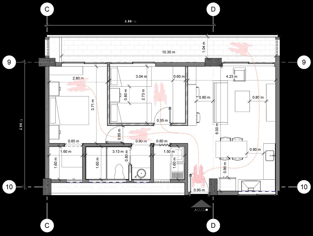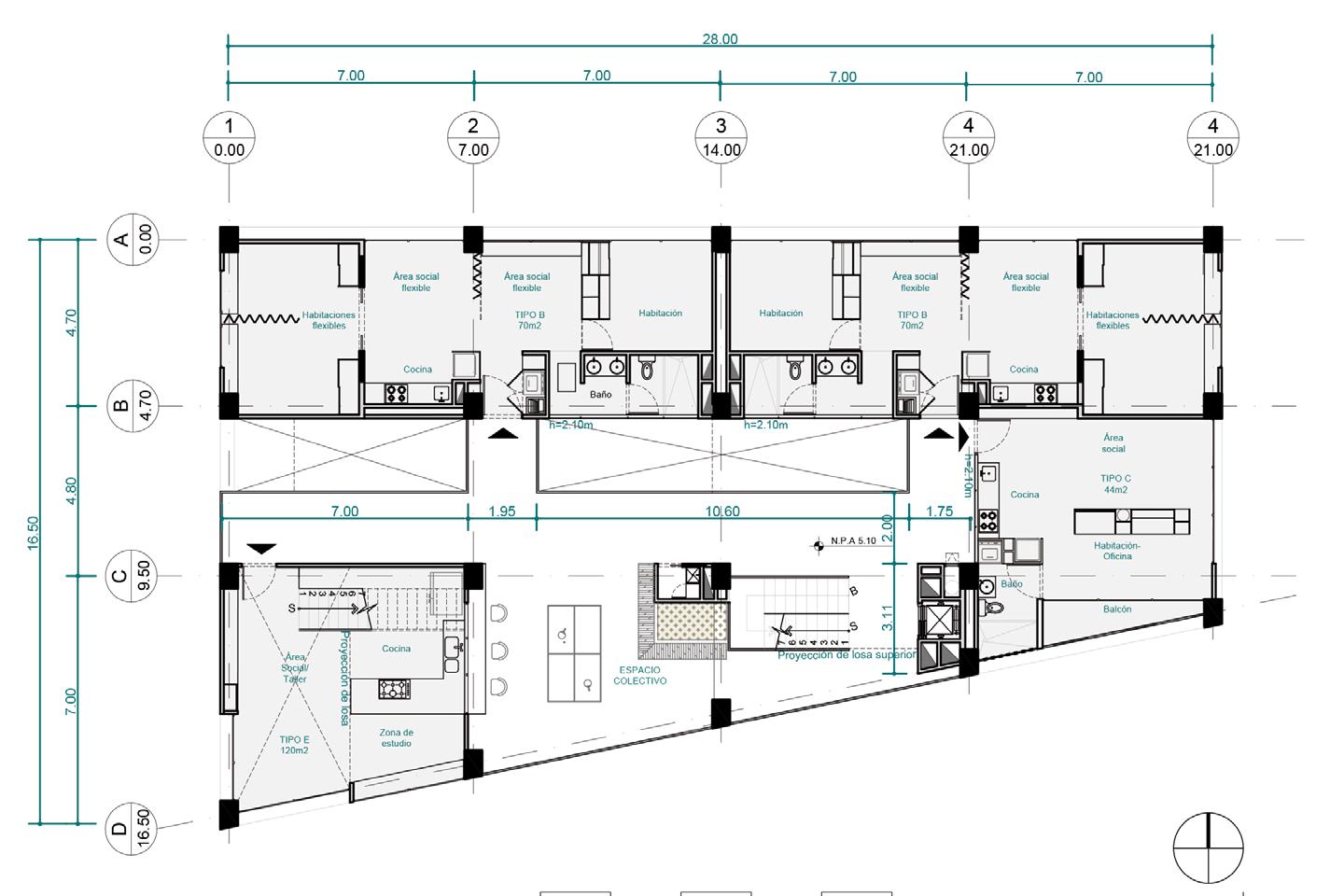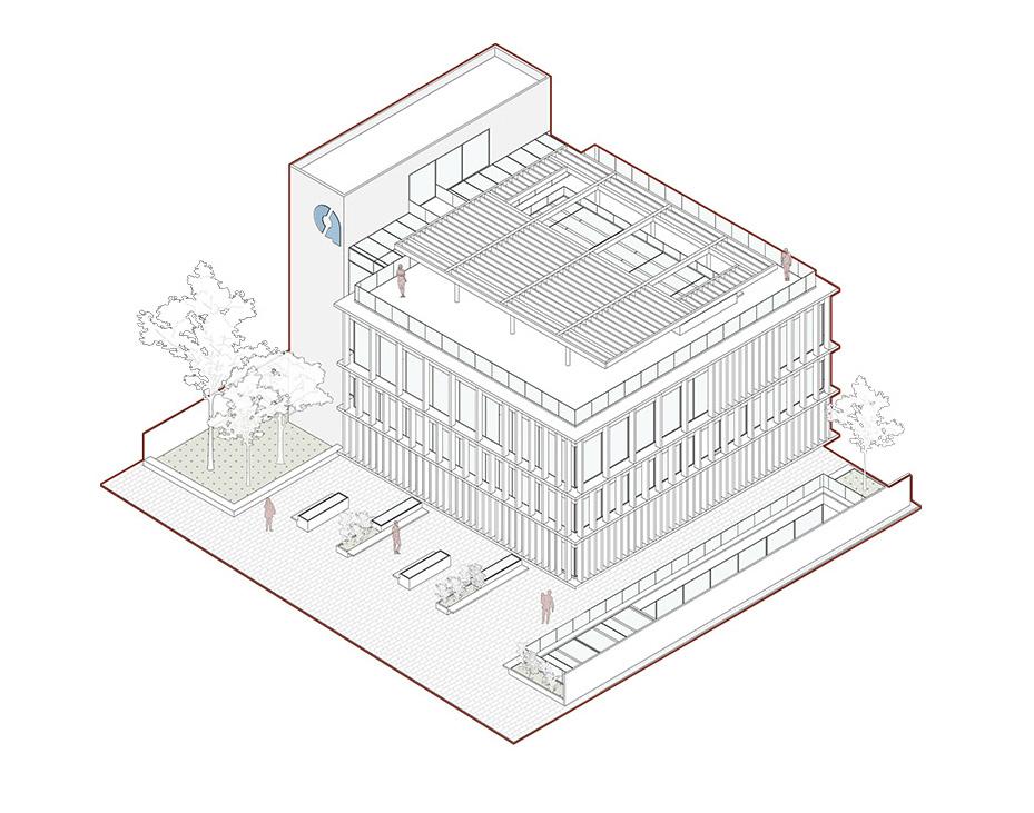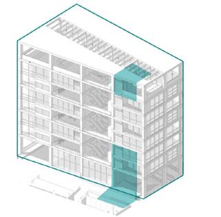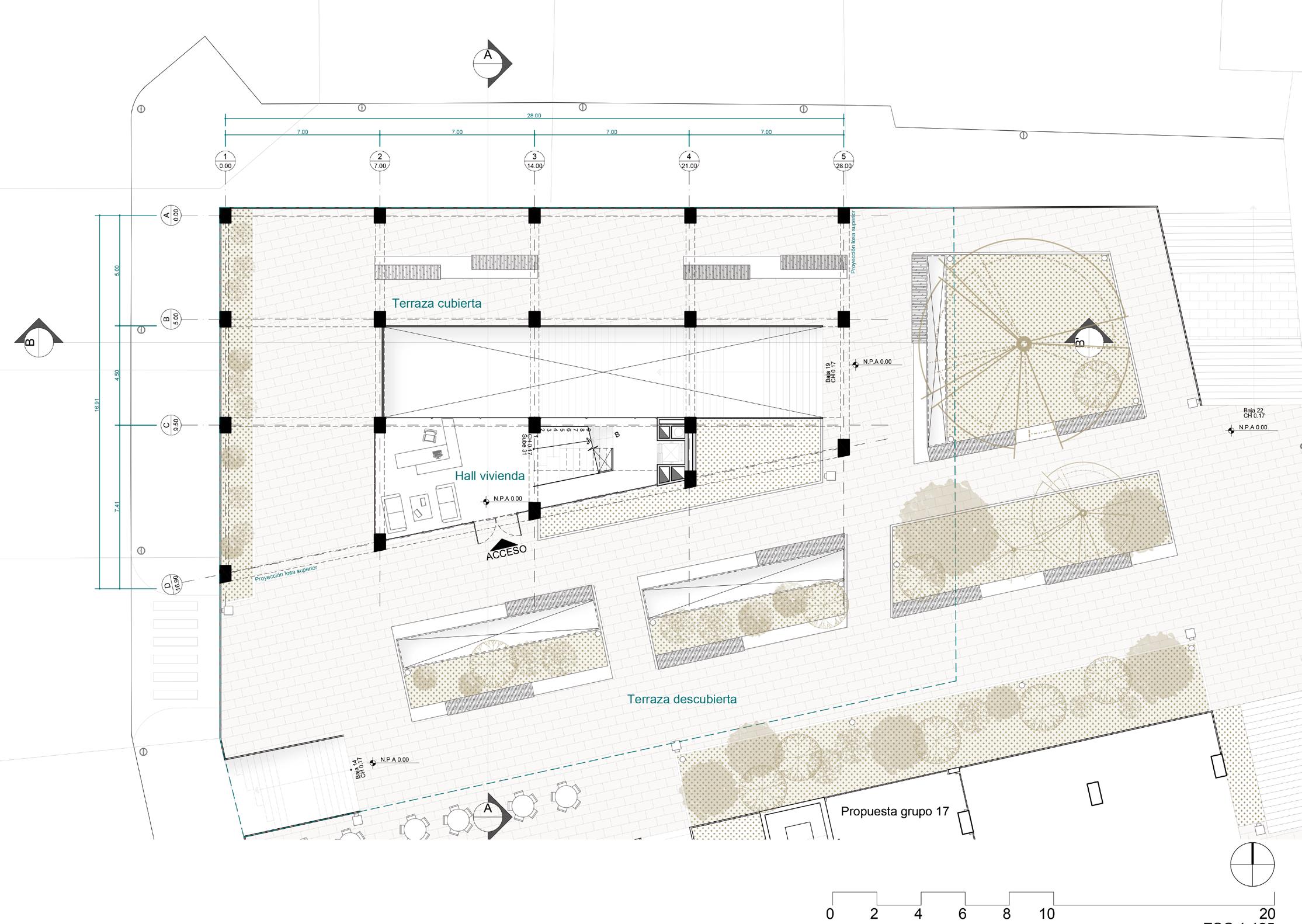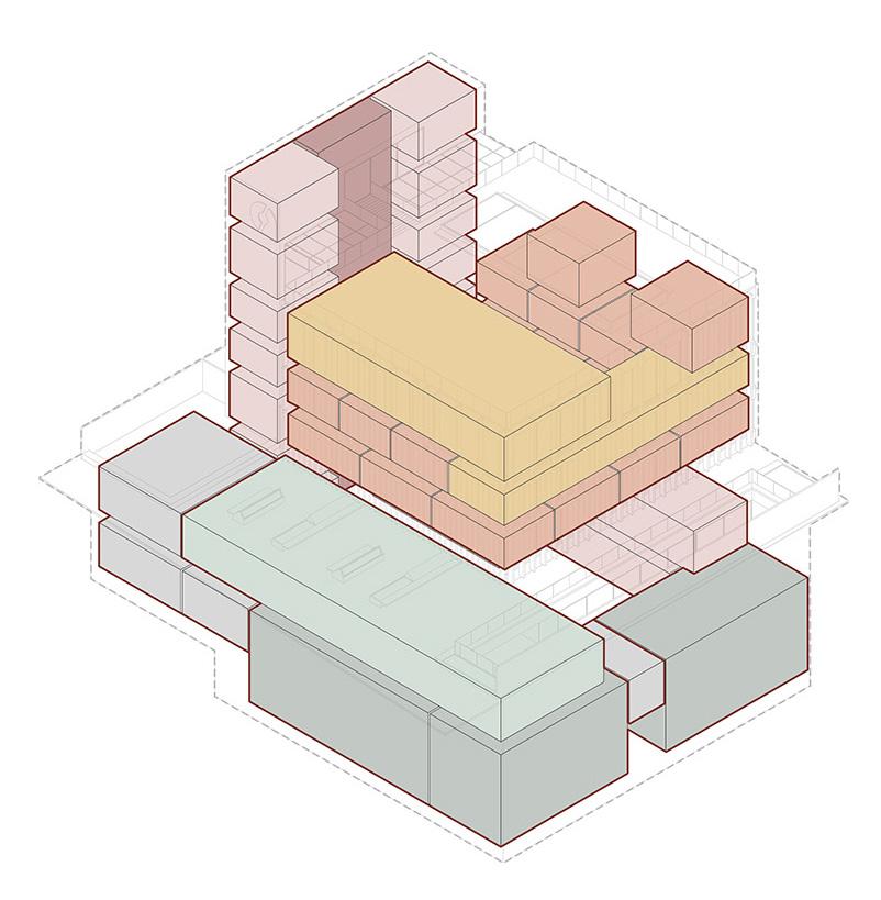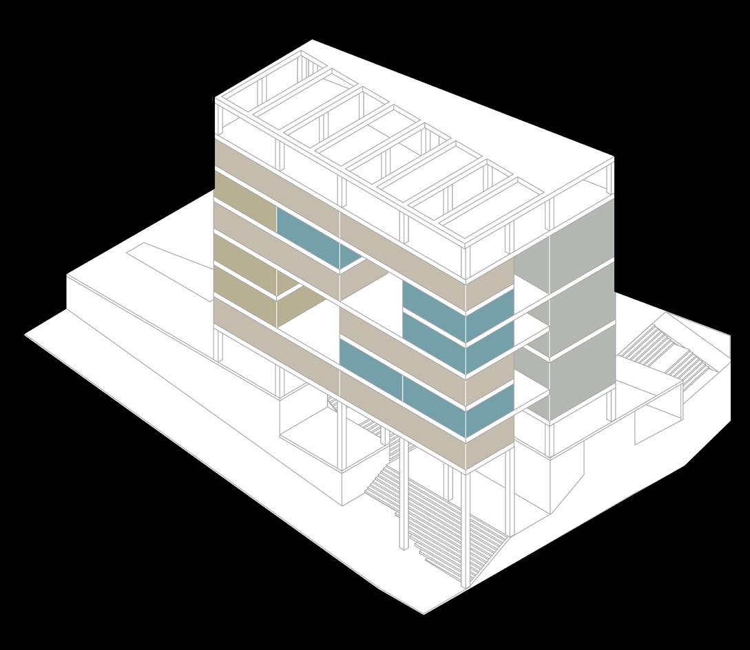 El proyecto articula el sistema de actividades entorno a un conjunto de espacios de uso colectivo y desprogramados, agrupando el sistema de circulaciones sobre un núcleo lateral. De este modo es posible aprovechar al máximo potencial del lote y garantizar la correcta ventilación e iluminación de los espacios interiores.