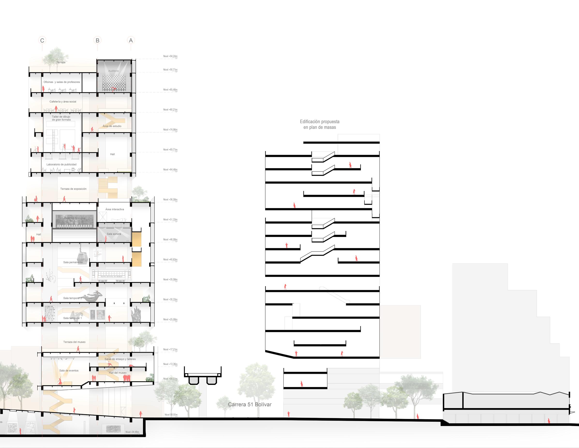 La propuesta se inserta en un tejido urbano existente, articulando la relación entre el río Medellín y el cerro nutibara.