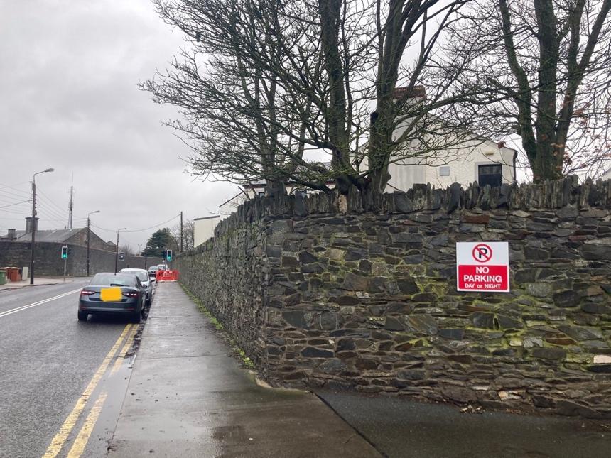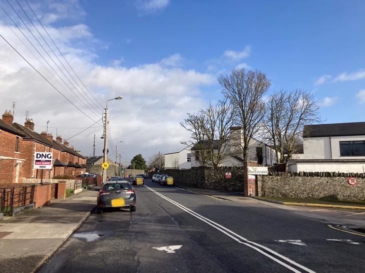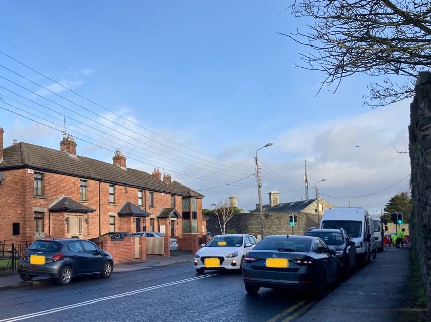 On the Ardee Road, it’s typical to see cars parked on the left after the traffic lights on a hundred-yard stretch before the side entrance to the school. On the other side of the road, often motorists park half on the pavement. There are two unbroken white lines running along the centre of this stretch.