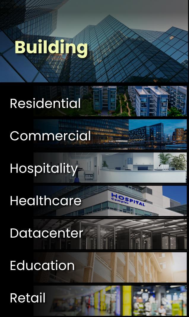 (Residential, Commercial, Hospitality, Healthcare, Datacentre, Educational and Retail)