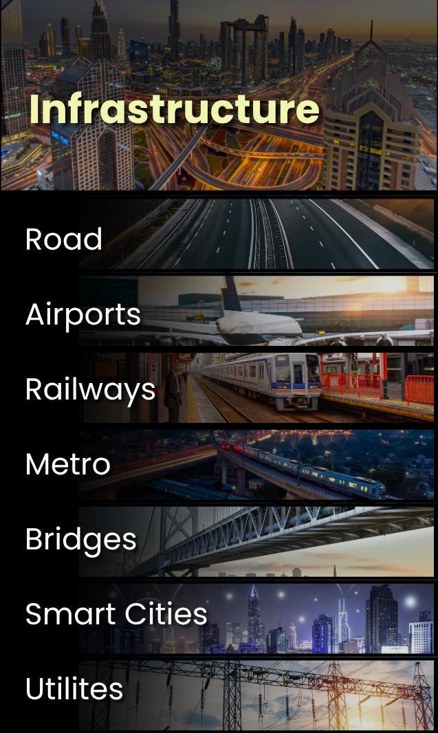(Road, Airports, Rail, Metro, Bridges, Smart Cities, Utilities)