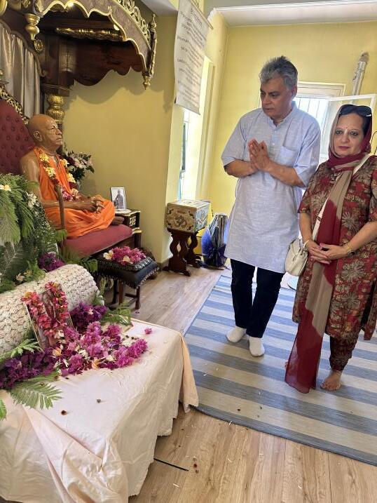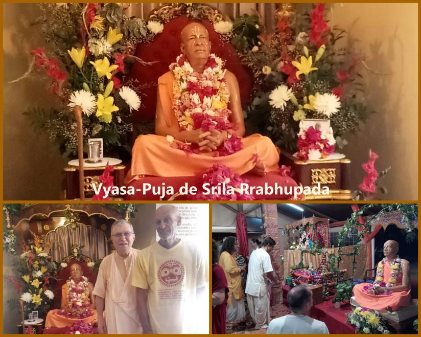 La celebración del vyasa-puja de Srila Prabhupada con Bhakti Sundar Goswami fue muy hermosa. Hubo abhisek, Guru puja y una encantadora conferencia dada por maharaj. El prasadam se componía de kachoris, sabji de berengenas, arroz dulce, y muchas otras preparaciones cocinadas por Hari Cakra das y Jagannath Nrishinga das.