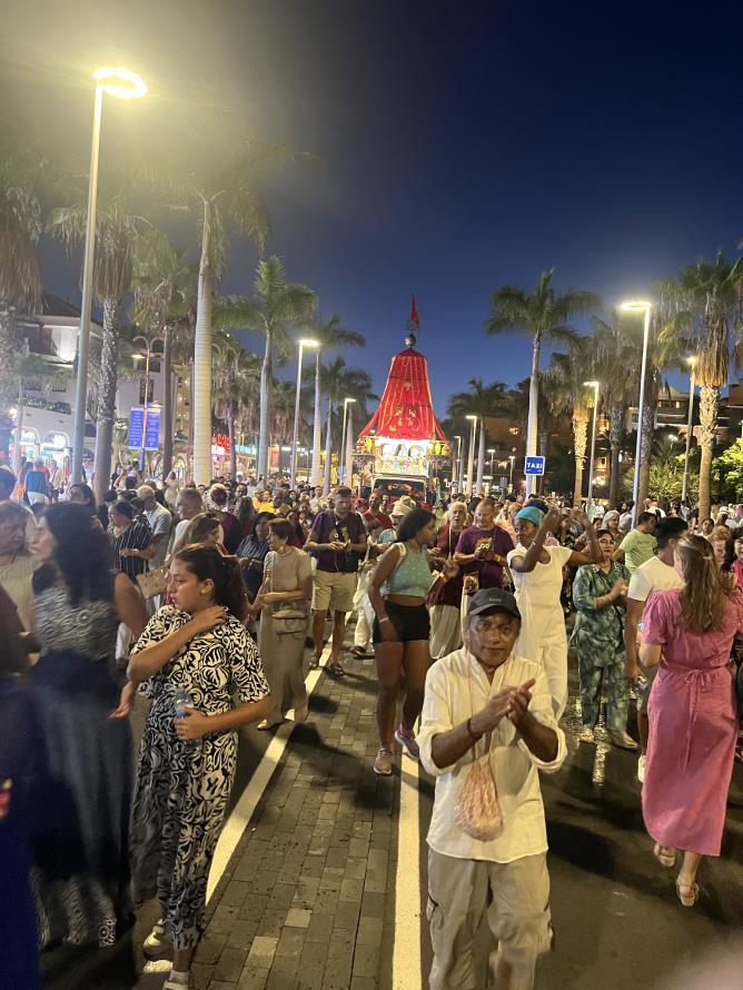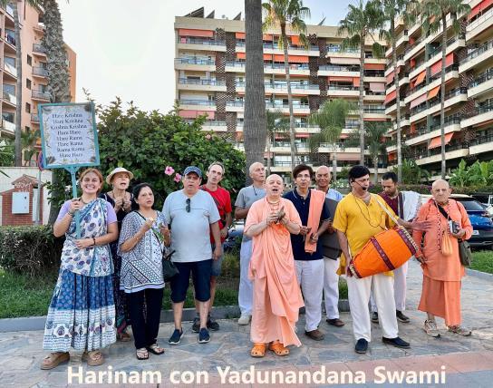 Tuvimos un hermoso harinam con Su Santidad Prahladananda swami en la calle San Miguel de Torremolinos. Fue unos días antes del Sri Krishna Janmashtami, lo que nos dio la oportunidad de invitar a la congregación india a venir a nuestro festival de Janmashtami y se distribuyeron más de mil panfletos al público. Fue muy agradable ver a todos los tenderos admirando nuestro harinam y acercándose incluso para unirse a nosotros en el kirtan. Antes de eso también tuvimos un poderoso harinam en la playa de Carihuela con Yadunandana maharaj.