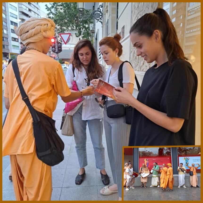 El magnífico equipo encargado de organizar estos programas mantiene un empuje encomiable. Salen cada semana como mínimo tres días, e intentan implicar al mayor número de devotos posible. Es espectacular ver su trabajo, y cómo interactúan con la gente de la calle haciéndoles participar en el canto y las danzas. Este trimestre hemos podido disfrutar de varios grupos de harinam itinerante provenientes de otros países, que nos ha ayudado a realizar este servicio.