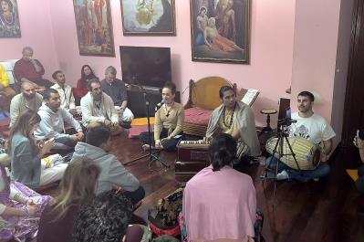 También seguimos realizando el programa de Kirtan-Mela la primera semana de cada mes, en el que intentamos que no solo participen los devotos del Templo, si no que puedan venir otros kirtaniyas experimentados de otros grupos para cantar los Santos Nombres