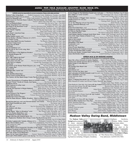 Hudson Valley Swing Band ������������ Wallkill Community Center, Middletown, Tuesdays, 1pm FREE Thunderhead Organ Trio jazz-fusion ��������The Wherehouse, Newburgh, 3rd Thursdays, 8pm FREE Music for Humanity folk ��������������Noble Coffee Roasters, Campbell Hall, 3rd Saturdays, 8pm FREE Band Concert & Warwick Dance Collective Warwick Summer Arts Festival ����������������������������������� Third Degree �������������������������������������������������Farmers’ Market Park, Rock Hill, Aug 1, 6:30pm FREE The Carl Richards Band ��������������������������������������������� Riverside Park, Port Jervis, Aug 1, 7pm FREE Shelley King Band Texas indie blues ���������������������������������������������The Falcon, Marlboro, Aug 1, 8pm Hot Flash & The Hormones vocals ���������� Run For Downtown Park, Middletown, Aug 2, 6pm FREE Unusual Suspects ��������������������������������������Veterans Memorial Park, Wurtsboro, Aug 2, 6:30pm FREE Three Hands Clapping ������������������������������������ Gazebo Park, Kauneonga Lake, Aug 2, 6:30pm FREE Hey Jude ����������������������������������������������������������������������������Sugar Loaf Crossing, Aug 2, 6:30pm FREE Andy Stack’s American Soup �������������������������������� The Falcon Underground , Marlboro, Aug 2, 8pm Dug The Band ��������������������������������������������������������������������Pennings Farm, Warwick, Aug 3, 6pm-9pm Diablo Station country, rock �������������������������������������Festival Square, Middletown, Aug 3, 7pm FREE Dierks Bentley w/Brothers Osborne & LANCO �������������������������������������� Bethel Woods, Aug 3, 7pm Eric Winter Group ����������������������������������������������������������������� Bullville Town Park, Aug 3, 7pm FREE E’lissa Jones Band Triversity Fundraiser ������������������������ The Phoenix, Dingmans Ferry, Aug 3, 8pm Common Tongue fusion �����������������������������������������������������������������The Falcon, Marlboro, Aug 3, 8pm Jamie McLean Band ������������������������������������������������ The Falcon Underground, Marlboro, Aug 3, 8pm Albi Beluli ������������������������������������������������������������������������������ Dancing Cat Saloon, Bethel, Aug 4, 8pm Upstate Rubdown rock �������������������������������������������������������������������The Falcon, Marlboro, Aug 4, 8pm Big Joe Fitz & The Lo-Fis swing, blues ����������������������The Falcon, Marlboro, Aug 5 & Aug 19, 11am Slam Allen ��������������������������������������������������������������Sullivan County Museum, Hurleyville, Aug 5, 2pm The Beach Boys w/The Righteous Brothers ����������������������������������������Bethel Woods, Aug 5, 7:30pm The Ronald Reagans 80s ��������������������������������� Mount Hope Town Park, Otisville, Aug 7, 7pm FREE Glass House ���������������������������������������������������Farmers’ Market Park, Rock Hill, Aug 8, 6:30pm FREE DJ G “80’s Night in the Park” ������������������������������������ Riverside Park, Port Jervis, Aug 8, 7pm FREE Pike & Sutton rock, blues ���������������������������������������������������������������The Falcon, Marlboro, Aug 8, 8pm E’lissa Jones Triofolk, rock ��������������������� Run For Downtown Park, Middletown, Aug 9, 6pm FREE Cathy Paty & Company ���������������������������������� Gazebo Park, Kauneonga Lake, Aug 9, 6:30pm FREE Still Surfin’ �������������������������������������������������