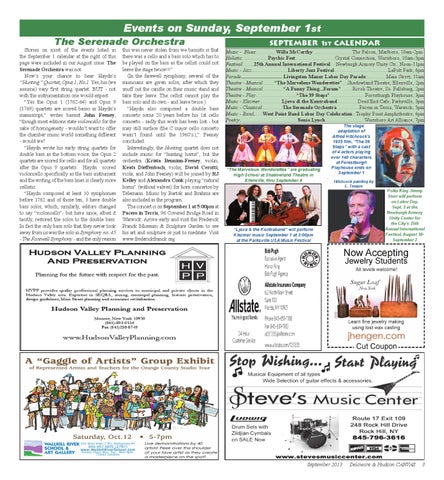 September 1st Calendar Music - Blues................Willa McCarthy...............................The Falcon, Marlboro, 10am-2pm Holistic....................Psychic Fest ������������������������������ Crystal Connection, Wurtsboro, 10am-5pm Festival.........25th Annual International Festival ����Newburgh Armory Unity Ctr., Noon-11pm Music - Jazz............................Liberty Jazz Festival ����������������������������������������� LaPolt Park, 6pm Parade................................. .Livingston Manor Labor Day Parade ���������������Main Street, 11am Theatre - Musical..........“The Marvelous Wonderettes” ����Shadowland Theatre, Ellenville, 2pm Theatre - Musical.................“A Funny Thing...Forum” ��������Rivoli Theatre, So. Fallsburg, 2pm Theatre - Play................................ “The 39 Steps” �������������������������� Forestburgh Playhouse, 3pm Music - Klezmer..................Ljova & the Kontraband ���������������Dead End Cafe, Parksville, 3pm Music - Classical................The Serenade Orchestra �����������������Pacem in Terris, Warwick, 5pm Music - Band........West Point Band Labor Day Celebration �� Trophy Point Amphitheatre, 6pm Poetry..............................................Sonia Lynch ������������������������������Wurtsboro Art Alliance, 7pm