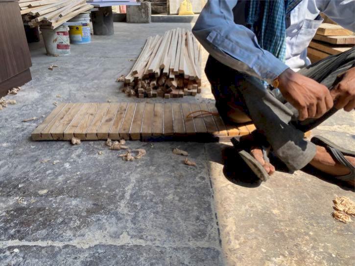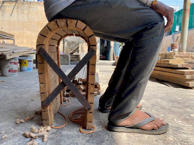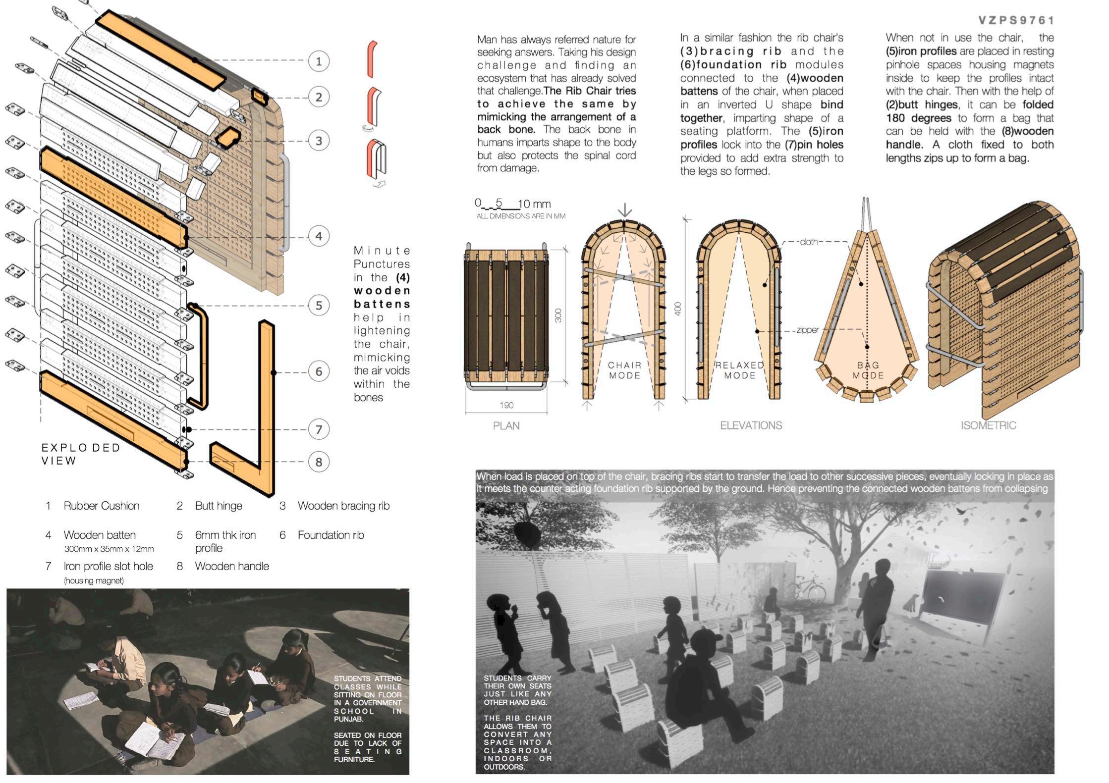 When load is placed on top of the chair, bracing ribs start to transfer the load to other successive pieces, eventually locking in place as it meets the counter acting foundation rib supported by the ground. Hence preventing the connected wooden battens from collapsing