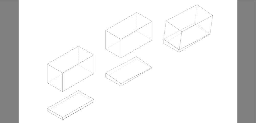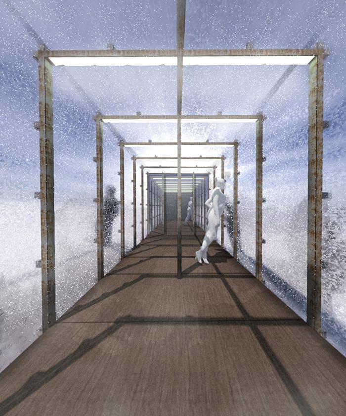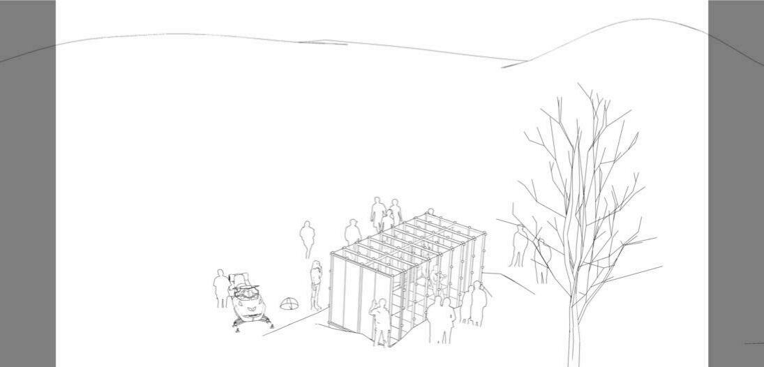 As seen in the interior perspective above, the users occupying the hut will experience an unnatural slope, this effect forces the person to always stand in a tilted manner so as to maintain his or her balance. A spectator will perceive it as distortion in gravity. The installed mirror accentuates the illusion by extending the field of view in the interior volume.
