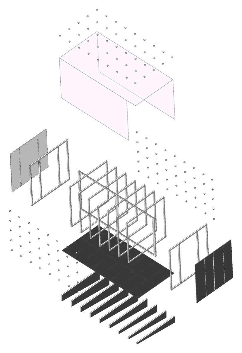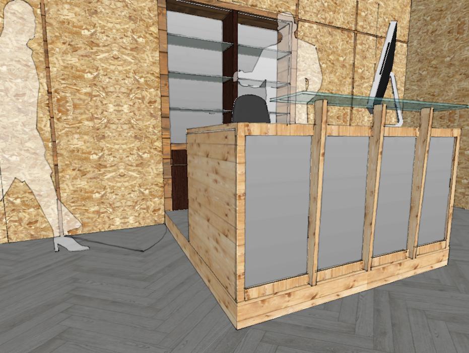 1 2 1 3 4 5 6 7 1. Magnet housing wooden blocks 2. Translucent/frosted plastic sheet 3. Interior mirror panel wall 4. Metal tubular section 5. Wooden ply partition fixed to M.S. tubular section 6. Wooden ply floor fixed to M.S. tubular section 7. Custom cut solid wood tapered sections