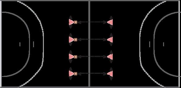 ØvelseSpillerne deles, så de er sammen parvis, hvorefter de to spillere i et par deles, så de er på hver sin side af hallens midterlinje. I øvelsen skal de blive på hver sin banehalvdel men må til gengæld bevæge sig frit på den banehalvdel, hvor de er placeret.