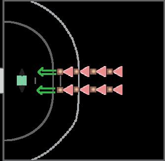Bolden afleveres til tilspiller, og spillerne angriber parvis i høj fart mod mål. Den ene modtager bolden fra tilspiller og finder hurtigt en god kasteposition og afleverer til sin makker, der modtager bolden og herefter har max tre skridt før afslutning.