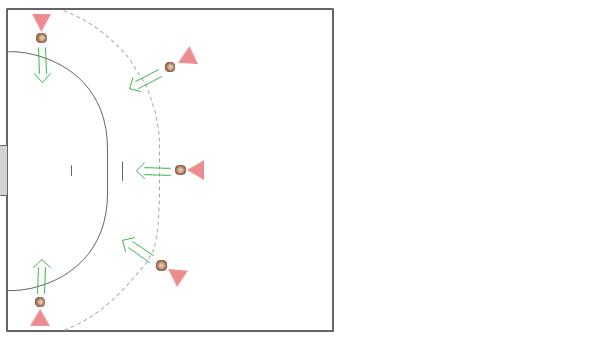 Spillerne står på alle positioner på nær stregpositionen med en bold hver. Skuddene falder i rækkefølge fra venstre fløj til højre fløj. Spillerne skyder frit i den øverste del af målet med tilpas afstand mellem skuddene, så målvogteren kan nå at komme tilbage til udgangspunktet mellem skuddene. Målvogterens udgangspunkt er brystkassen ud for bolden. Udfald skal ske vinkelret på boldens bane i skuddet (=90°)