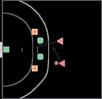 Et område midt på målcirklen afgrænses af kegler. Der trænes en 1:1 situation med gennembrud eller skud for playmaker. Playmakeren arbejder stenhårdt, mens de to øvrige angribere er stillestående.
