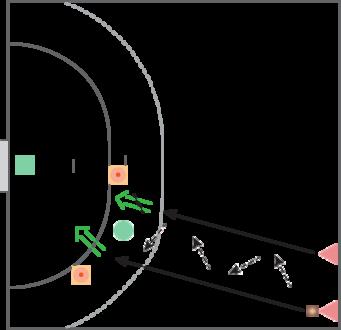 Et område på målcirklen afgrænses af to kegler. Områdets størrelse afhænger af spillernes niveau. Fra god afstand (7-8 meter) angribes i høj fart. Den spiller, der får bolden lige omkring tremeterlinjen, har nu to muligheder: forsvarer dækker, så der afleveres til angrebsmakkeren. forsvareren dækker ikke, og der kan - med tre skridt - søges afslutning.