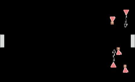En kegle stilles på gulvet, og en forsvarer stiller sig ca. en halv meter foran keglen Tre angribere har en bold og stiller sig i en trekant med hver spiller placeret som udgangspunkt 3 meter fra keglen