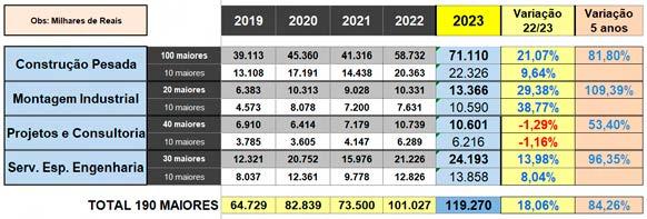 Nesse período de cinco anos, 2019 a 2023, as 100 maiores Construtoras revelaram uma expansão consolidada de 81,80% na receita bruta. Montagem Industrial atingiu a melhor performance dos quatro setores, somando 109,39% de alta no faturamento bruto das 20 maiores empresas do segmento. Projetos e Consultoria obteve 53,40% de crescimento nas vendas de serviços das 40 maiores do setor. Serviços Especiais de Engenharia cravou 96,35% de alta na receita bruta conjunta das 30 maiores do ramo. São números que merecem ser comemorados!