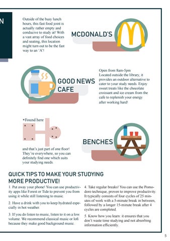1. Put away your phone! You can use productiv- 4. Take regular breaks! You can use the Pomoity apps like Forest or Tide to prevent you from doro technique, proven to improve productivity. using it while still listening to music. It typically consists of four cycles of 25 minutes of work with a 5-minute break in between, 2. Have a drink with you to keep hydrated espefollowed by a longer 15-minute break after 4 cially in hot weather. cycles are completed. 3. If you do listen to music, listen to it on a low 5. Know how you learn: it ensures that you volume. We recommend classical music or lofi don’t waste time studying and not absorbing because they make good background music. information efficiently.