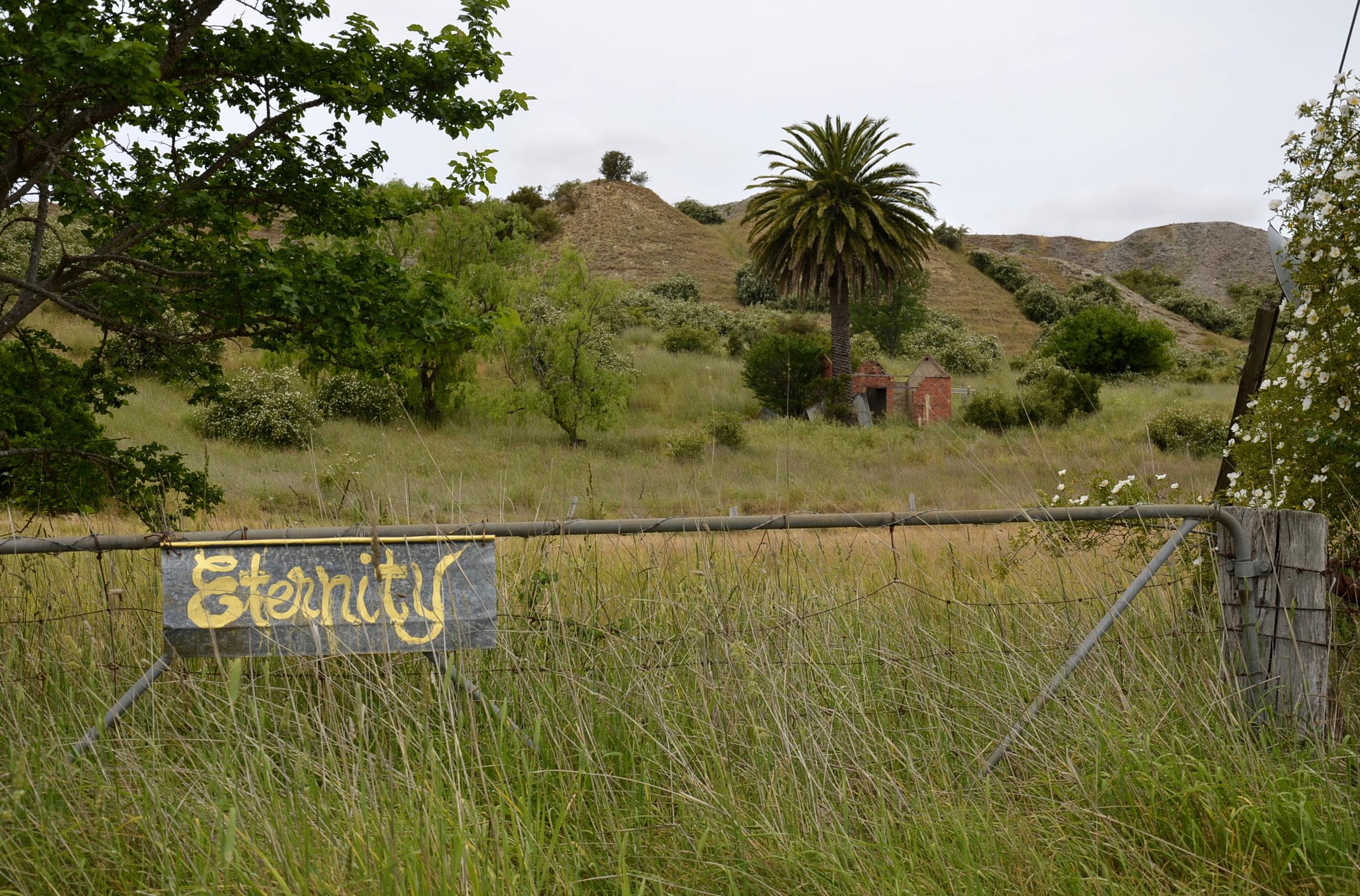 Clunes is a unique place (as you know) and one of the evocative things about it is the quirky Eternity sign to be spotted as you meander along Station Flat Road. There it is, painted in a kind of faded lemon yellow in a flowing yesteryear cursive script and affixed to a rusty gate that leads to…well eternity, really.