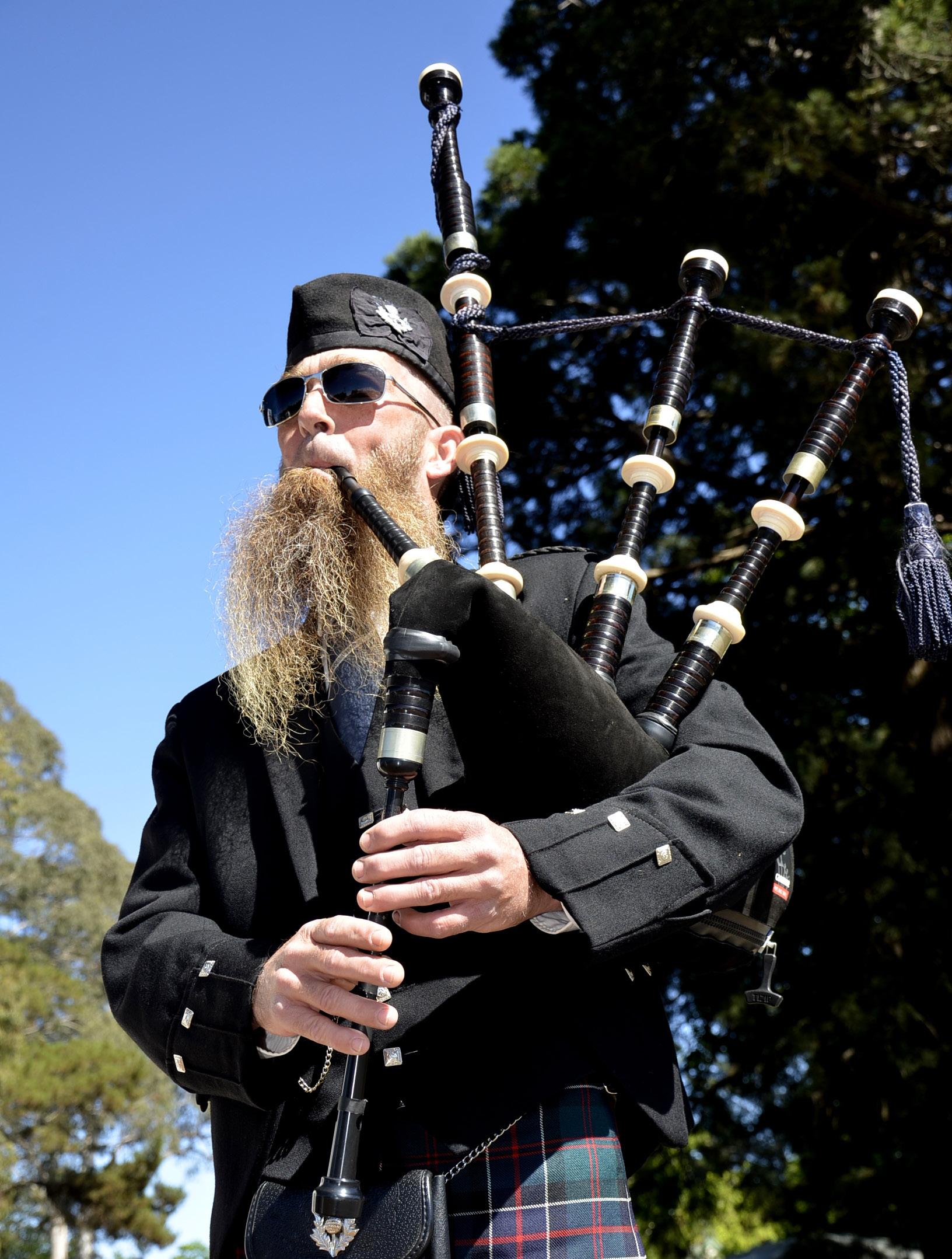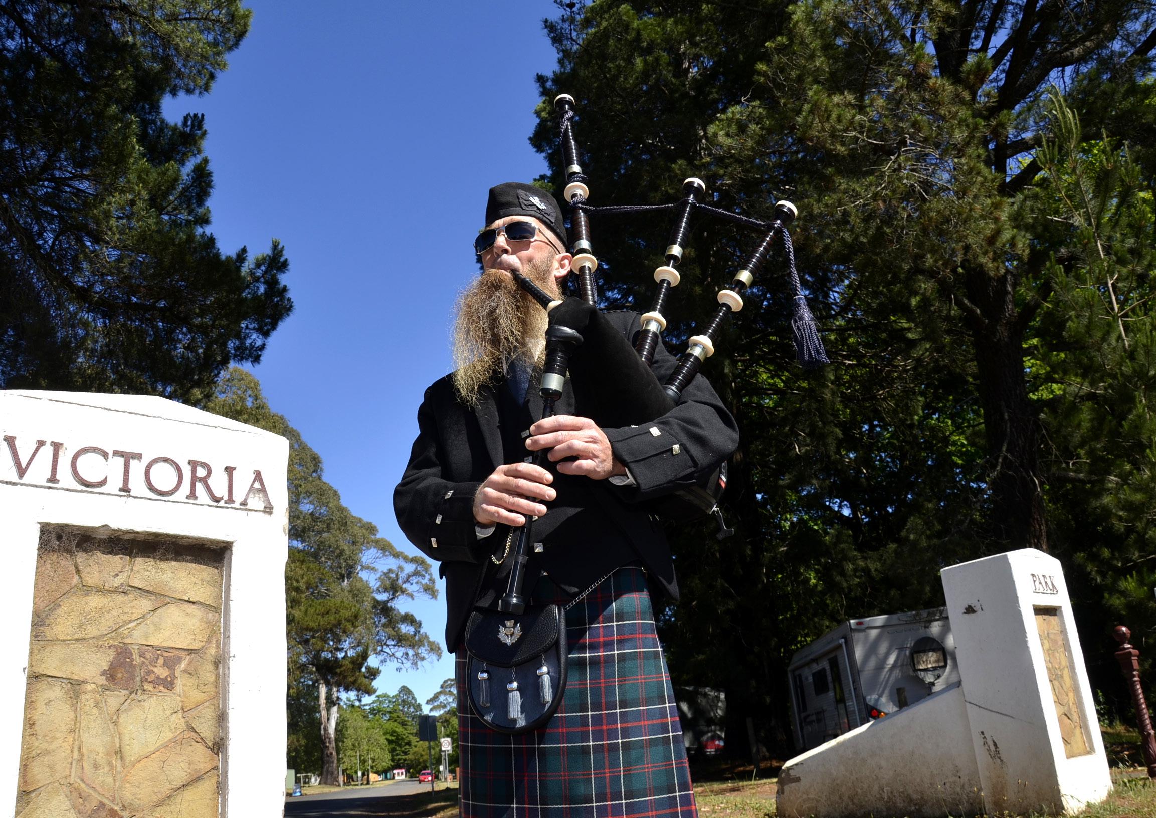 Above, Pipe Major Langley Rowbottom of Daylesford and District Pipes and Drums practises for this Saturday’s Daylesford Highland Gathering and Heavy Games