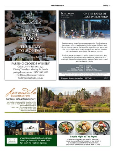 CellarCellar DoorDoor 7 days 10am-5pm 7 days 10am-5pm Dining Thursday - Monday forLunch Lunch Dining Thursday - Monday for passingclouds.com.au | (03) 5348 5550 passingclouds.com.au | (03) 5348 5550 For Dining Room reservations: For Dining Room reservations: @ feast passingclouds.com.au feast@passingclouds.com.au