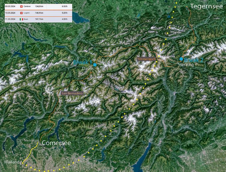 Gesamtübersicht der Tour: Anreise mit Flugzeug und Bahn über Mailand nach Mendrisio. Tag 1: Start in Caviano, es geht über den San Bernardino Pass bis nach Davos. Dort erste Übernachtung im Zelt, am 2. Tag geht es weiter über das Patznaun, Inn- und Pitztal nach Sterzing. Nach einer weiteren Nacht auf 2.100 m fliege ich am 3. Tag zurück an den Tegernsee.