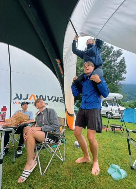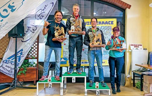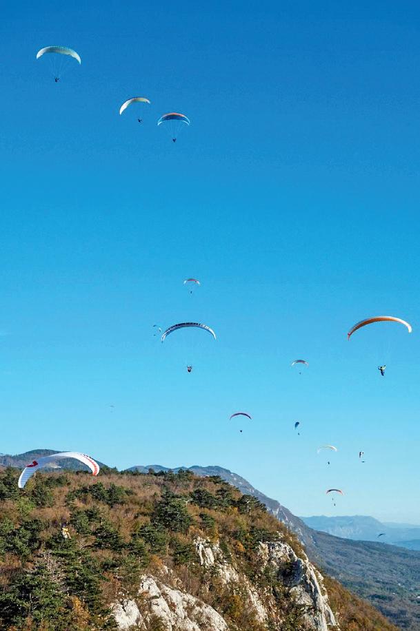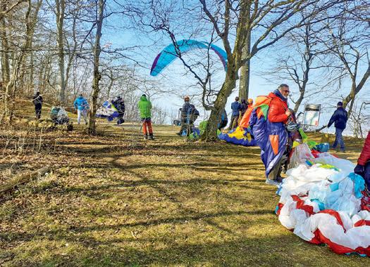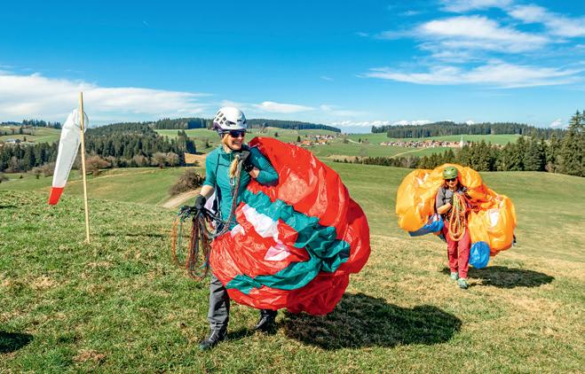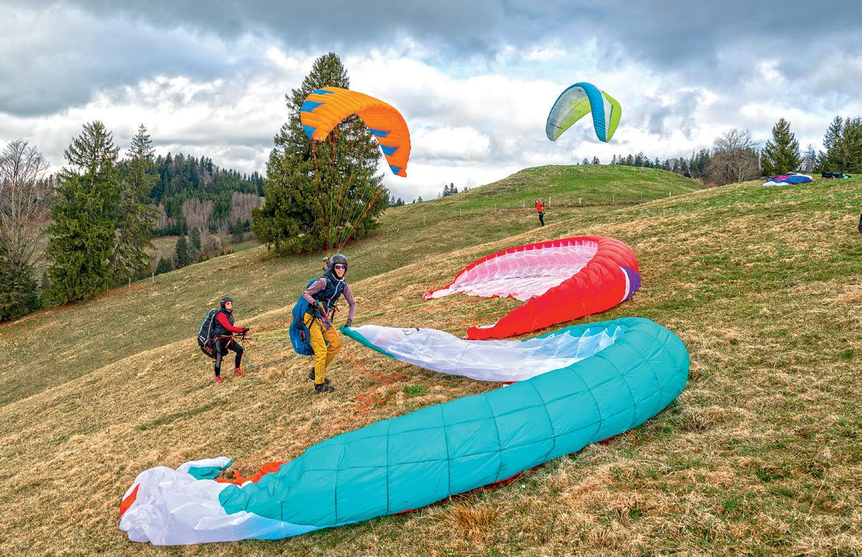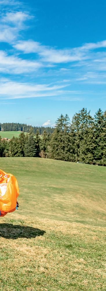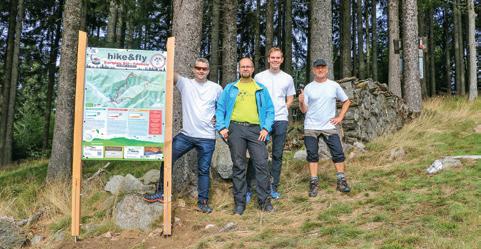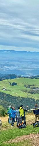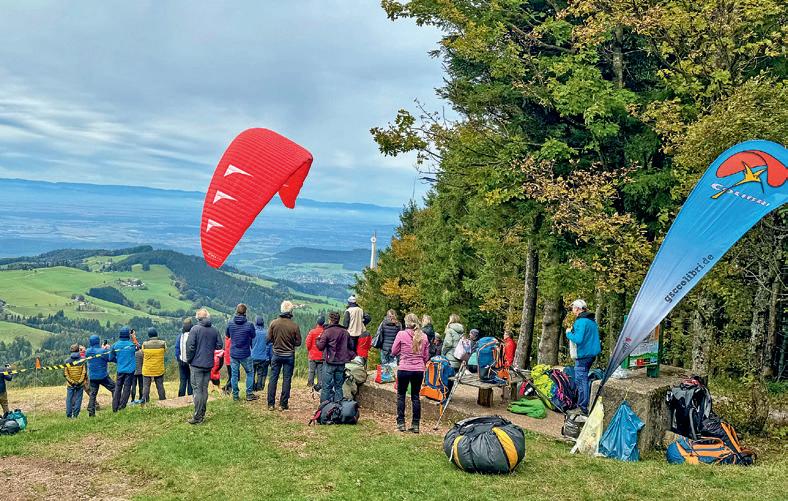 tenzierten sich Ideen, was in unserem Fall dazu führte, dass die Tracks auch für das Erstellen von Hike&Fly Infotafeln dienten. Auf diesen bildeten wir Informationen zum Fluggebiet, eine Karte mit den Routen und eine Beschreibung dieser ab. Die Tafeln sollten an den Start- und Landeplätzen positioniert werden und auch jenseits unserer Veranstaltung Gastpiloten eine Orientierung bieten und das Hike&Fly im Schwarzwald fördern. Am 11. Oktober 2020 war es soweit und die erste Black Forest X Trophy startete mit 60 Teilnehmern am Kandel. „Das war schon sehr cool”, erinnert sich Franz, einer der drei Organisatoren. „Wir hatten Eventshirts, als Hygienekonzept be-