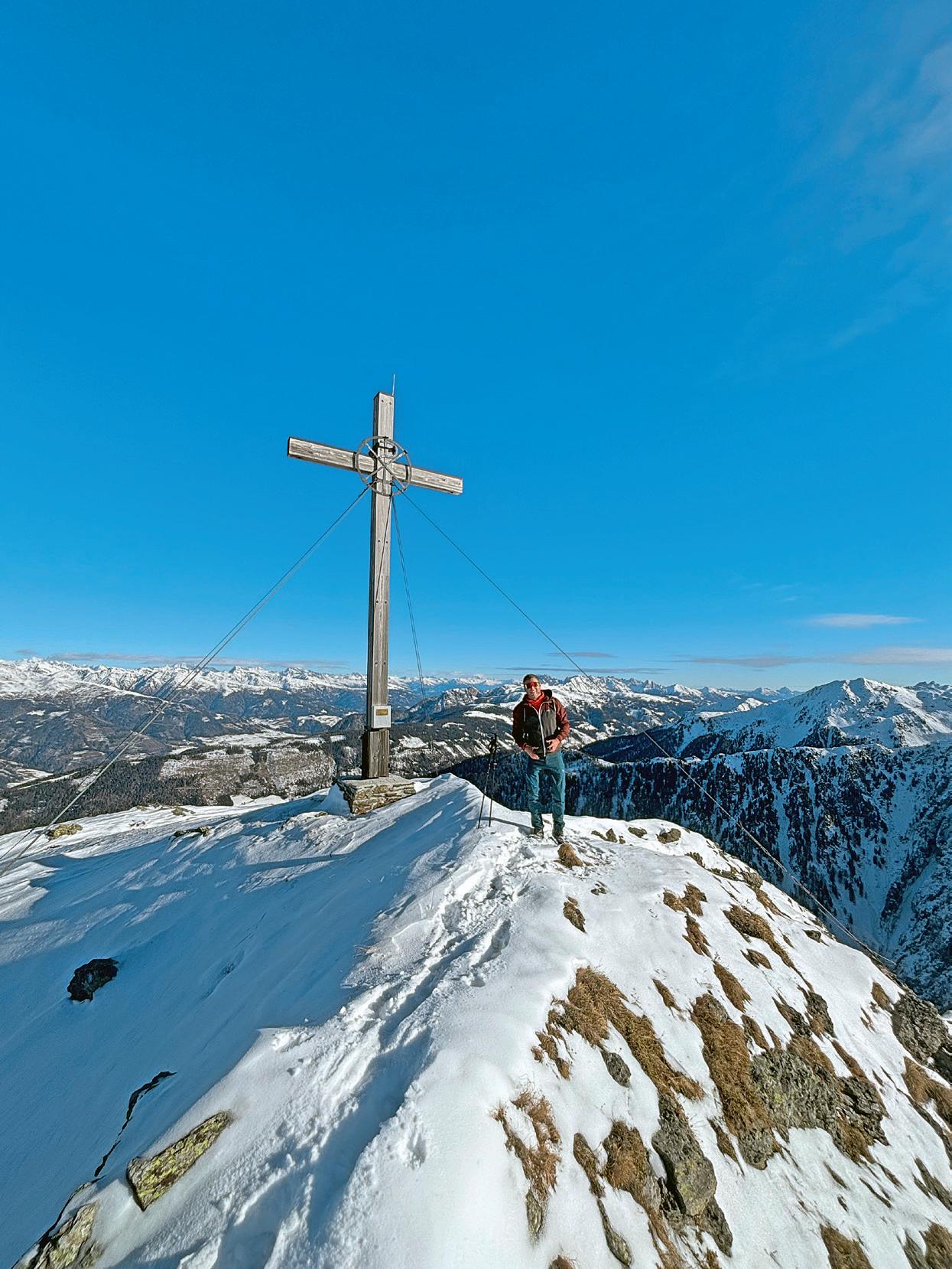 Der weitere Weg ist mit den bekannten rot-weiß-roten Streifen markiert, allerdings ist der Wegverlauf manchmal kaum zu erkennen und erfordert unsere Aufmerksamkeit. Kurze Zeit später eröffnet sich uns der Blick auf den sonnenbeschienenen Gipfel der Gatterspitze und wir erkennen mit dem Gipfelkreuz unser Ziel. Einige Meter links vom Gipfel können wir schon die schneebedeckten und im Sommer grasbewachsenen Startplätze erahnen. Mit dem Ziel vor Augen nehmen wir die letzten Meter in Angriff. Der Weg macht nochmals einen Bogen, der uns vom Gipfel weg zu führen scheint und ändert später jedoch wieder seine Richtung. Da uns das weithin sichtbare Gipfelkreuz während eines Großteils der Strecke Orientierung bietet, können wir uns auch dann nicht verlaufen, wenn wir für kurze Zeit keine Wegmarkierung erkennen oder wir uns entscheiden sollten, den Weg zu verlassen, um direkt an der Flanke aufzusteigen. Das Gipfelkreuzfoto gebührt Manuel, da er heute zum ersten Mal auf der Gatterspitze steht. Obwohl dieser Berg mit 2.430 m nicht zu den höchsten Gipfeln in der Region gehört, beeindruckt sie durch die einmaligen Ausblicke in alle Himmelsrichtungen.