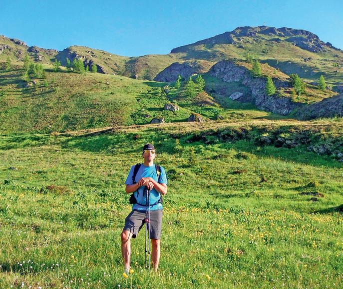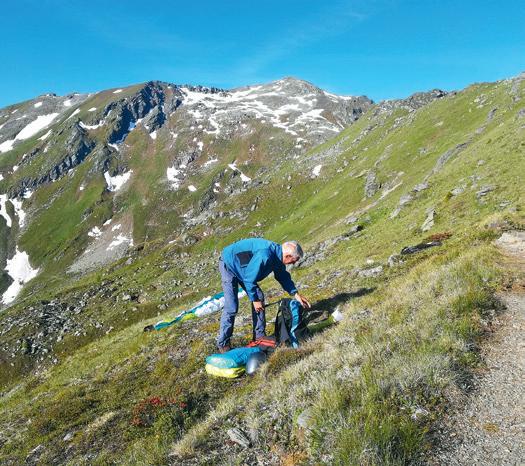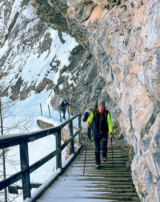 noch Grödel anlegen. Spätestens beim Aufstieg durch die Steilflanken in der zweiten Hälfte der Tour verbessern sie spürbar die Trittsicherheit. Devise: unnötige Risiken vermeiden. Die Wetterbedingungen für den heutigen Tag sind nahezu perfekt.