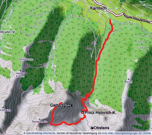 Aufstiegsvarianten: Man folgt dem gut ausgeschilderten und markierten Weg Nr. 466, Varianten führen direkt über die Flanken vom Obstanser Almboden zum Gipfelkreuz.